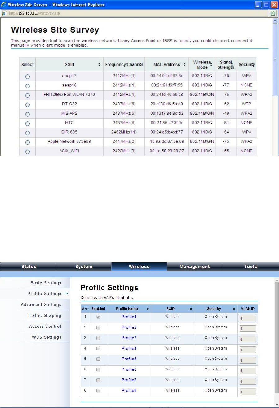 In addition, you can start “Site Survey” in “Wireless Basic Settings” to check the signal