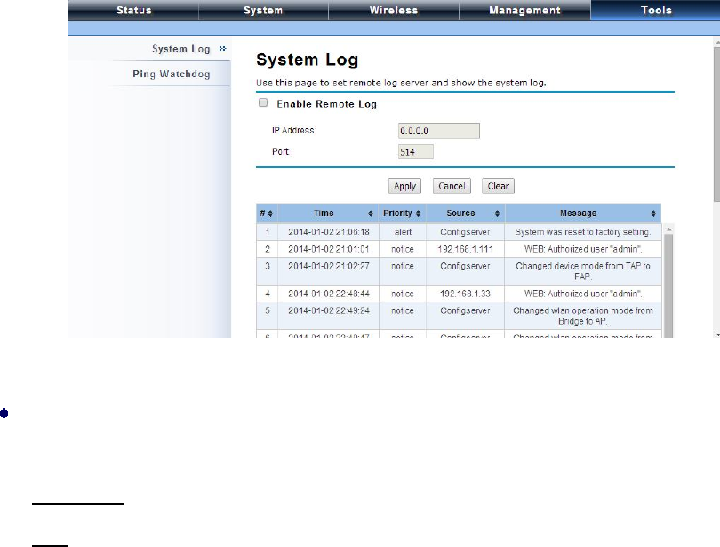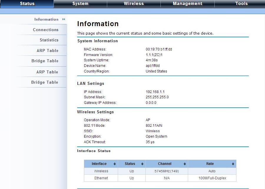 Information includes system information, LAN settings, wireless setting and interface status. Click