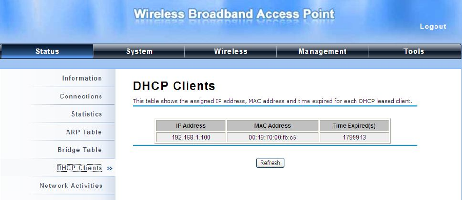 expired for each DHCP leased client. Click “Refresh” to view current table.