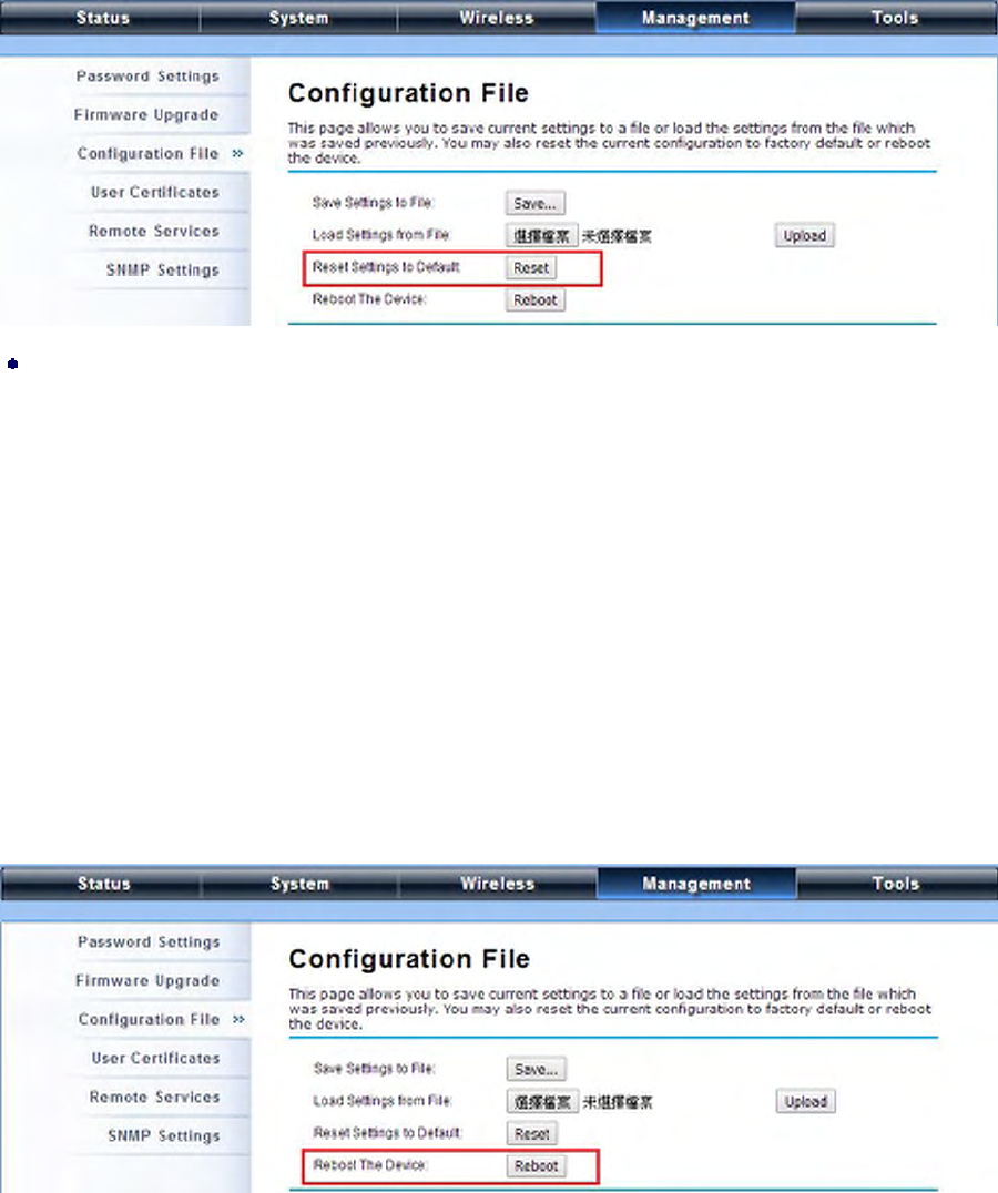 You can reboot your IEEE 802.11n ZAC Access Point from “Configuration File” in “Management” as