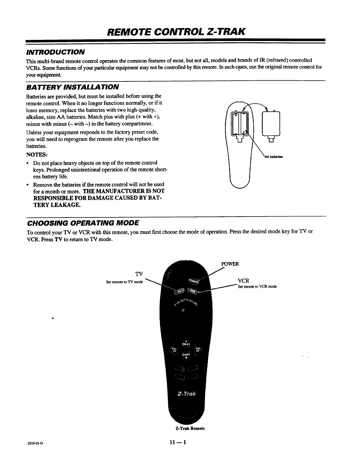 Battery Installation, Operating Mode, TV Operations,
