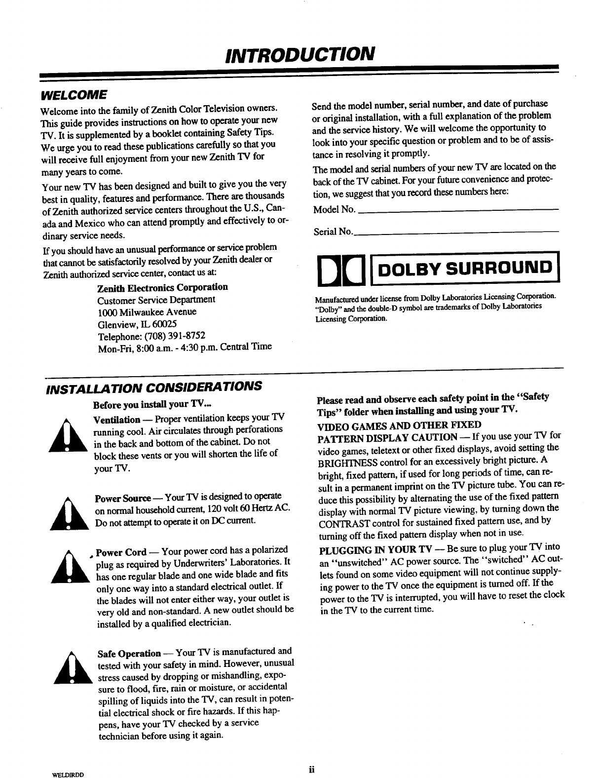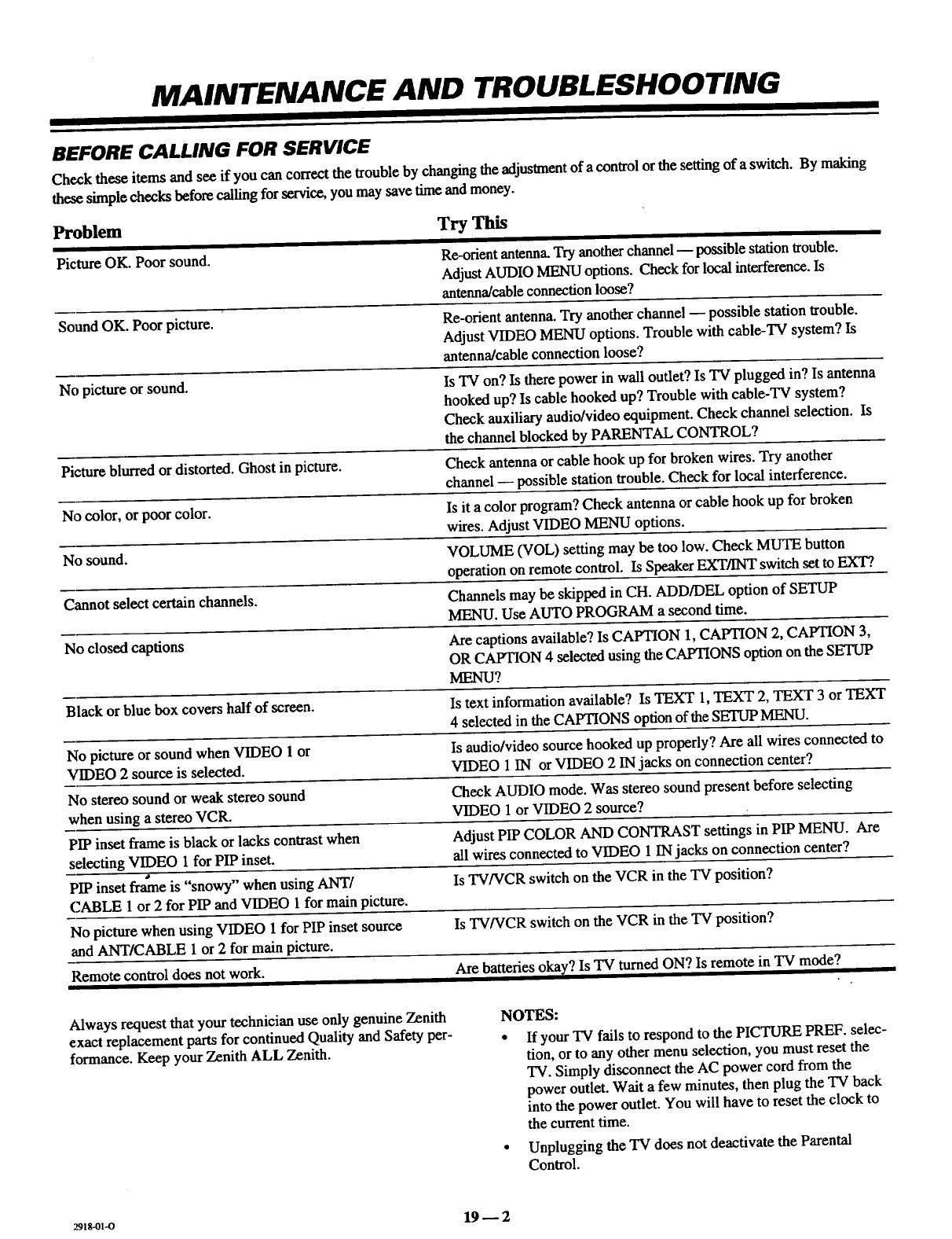 ZENITH Direct View Digital 27 To 40 TV Manual 97110081