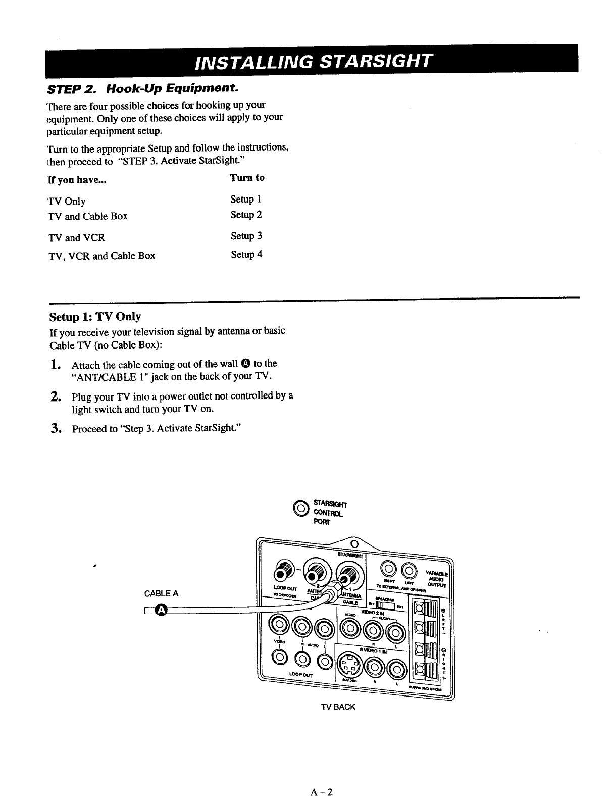Press TV/VCR Source and select "Ant/Cable 1" or StarSight if named.