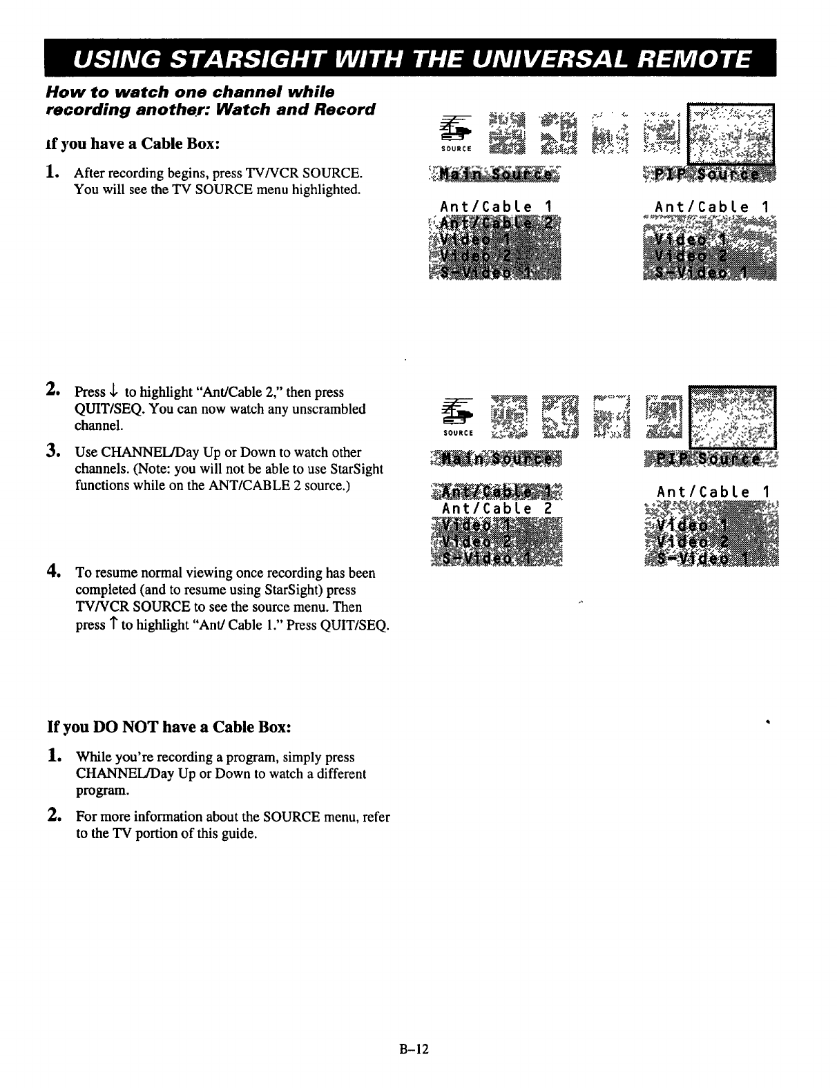Ihave a Cable Box, and want to watch one While a recording is in progress, change your source to "ANT/CABLE 2" to watch