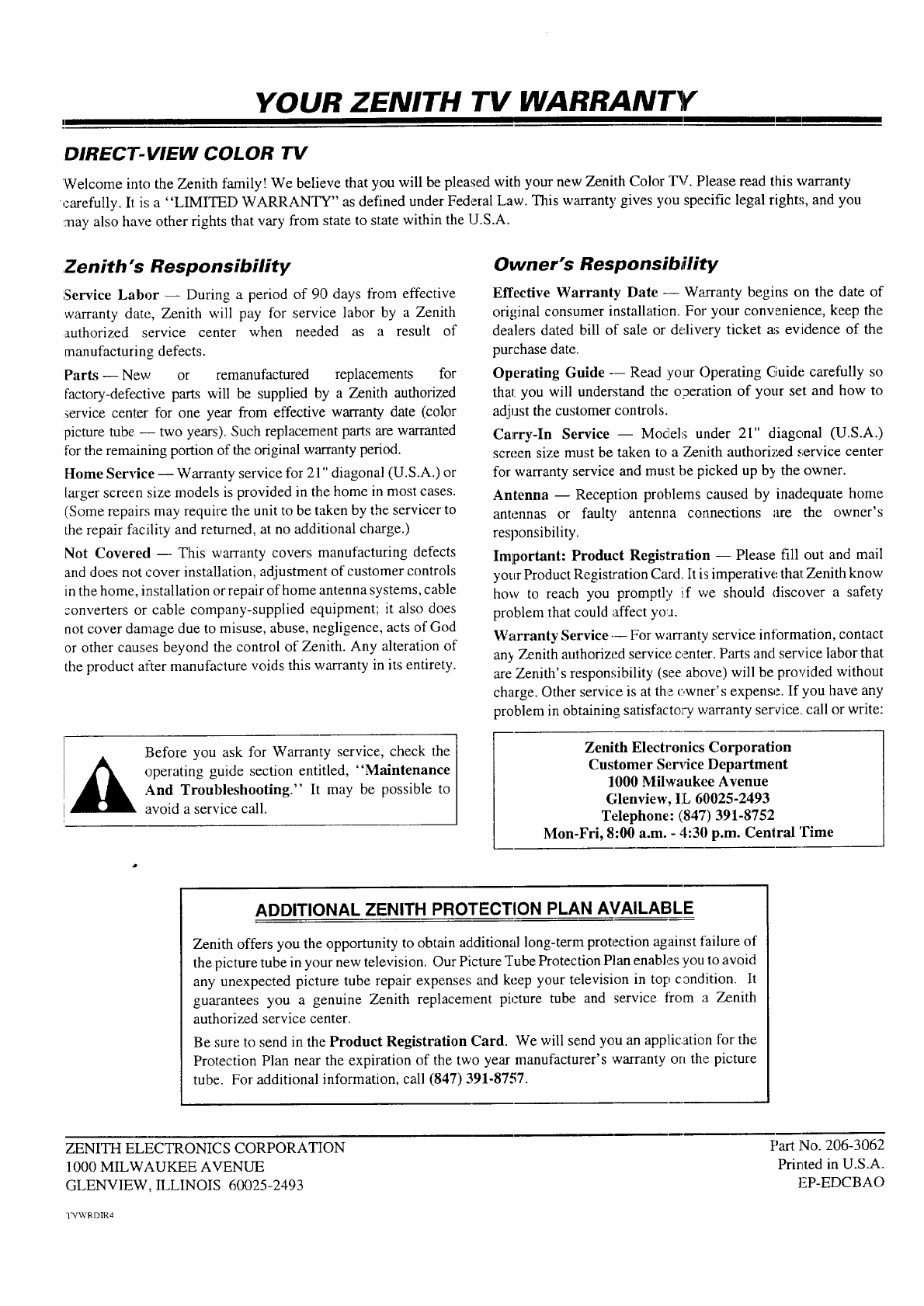 YOUR ZENITH TV WARRANTY