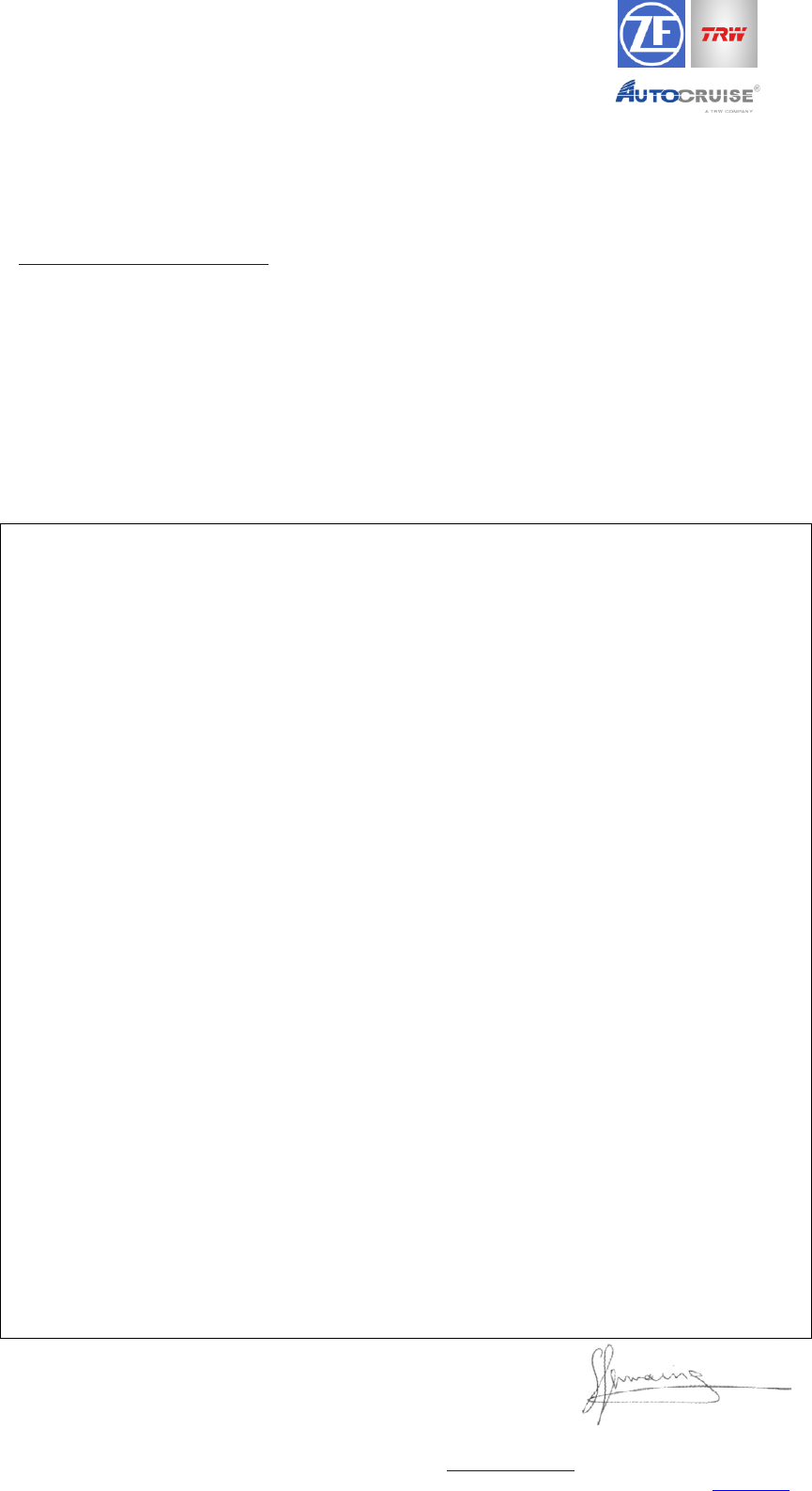 Changes or modifications made to this equipment not expressly approved by ZF TRW AUTOCRUISE