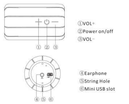 power on/off button② to play/pause music, through the "VOL +、VOL-"adjust the