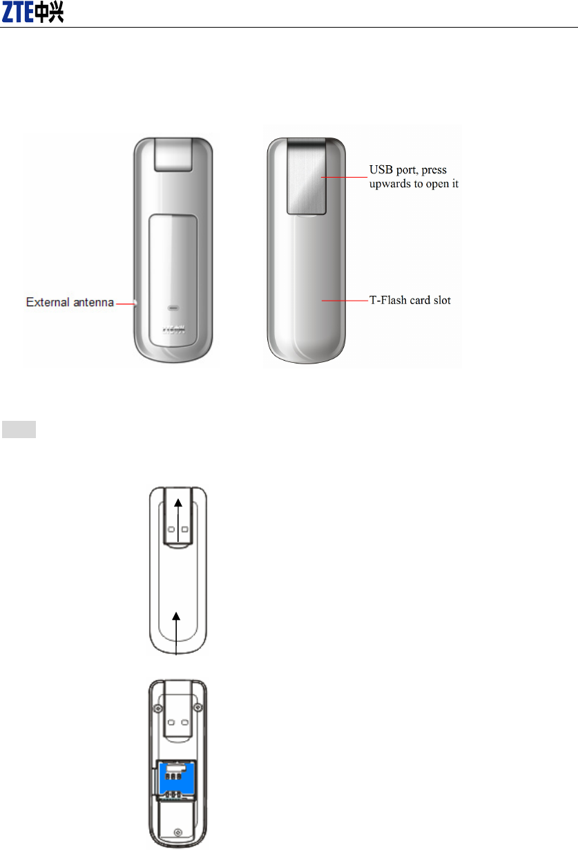 1. Take out USB interface and R-UIM card cover in the direction indicated by the arrow.