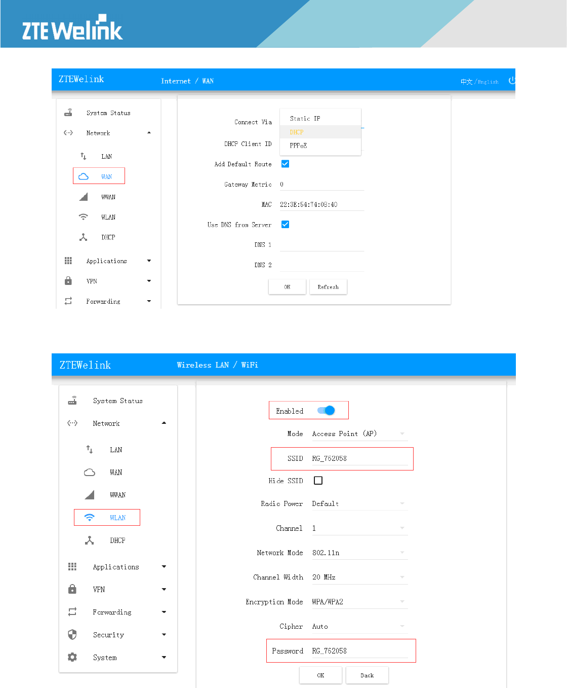 Select "WLAN" option in the network configuration, turn on the wireless status, set SSID number and password.