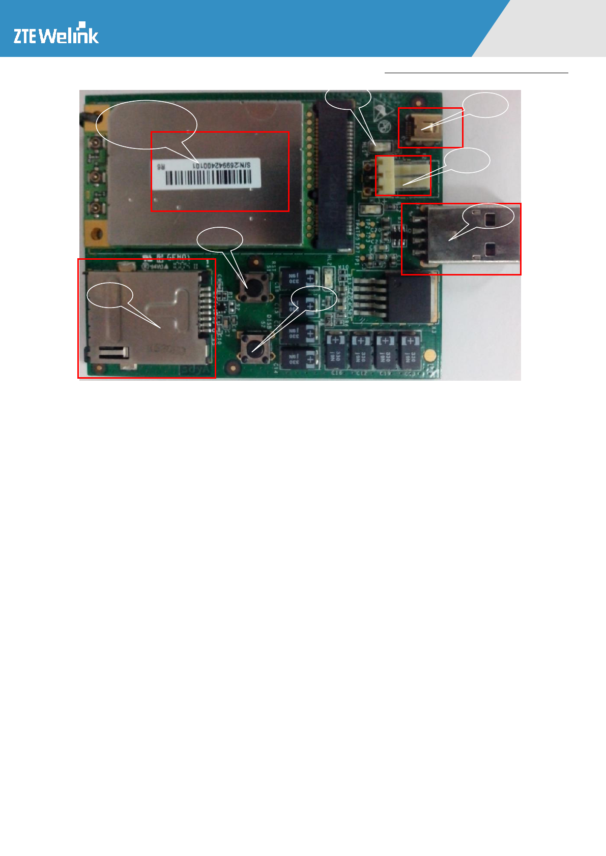 Note: 1 – UIM card console; 2 –JTAG downloading interface; 3- DC power interface; 4 – USB interface; 5 – LED indicator; 6