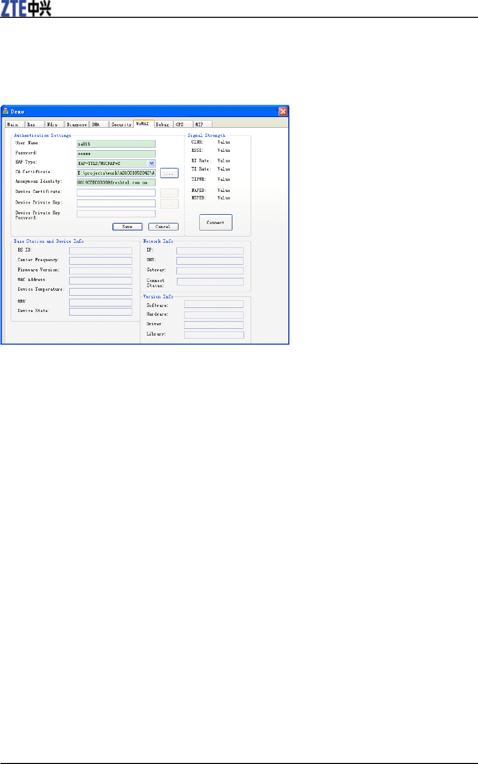 • Device information for WiMAX: Mac Address, Firmware version, Hardware version, CINR, BSID,