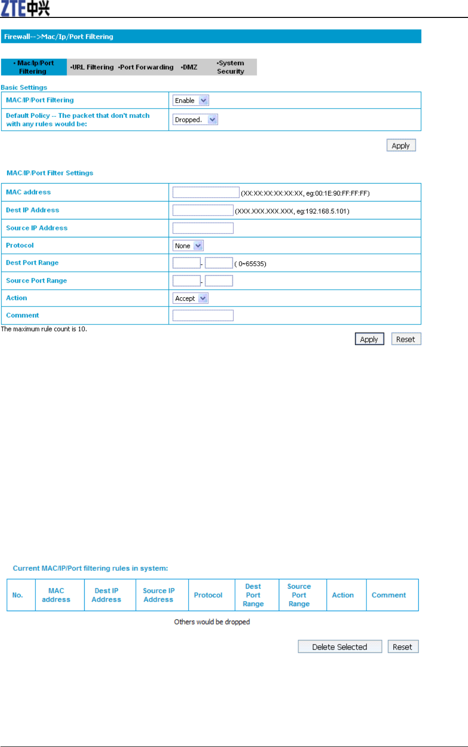 The following figure shows you the current MAC/IP/Port filtering rules in system.