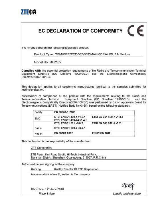 ZTE ZTEMF210V GSM/GPRS/EDGE/WCDMA/HSDPA/HSUPA 850/1900 Module User Manual Q78 ZTEMF210V