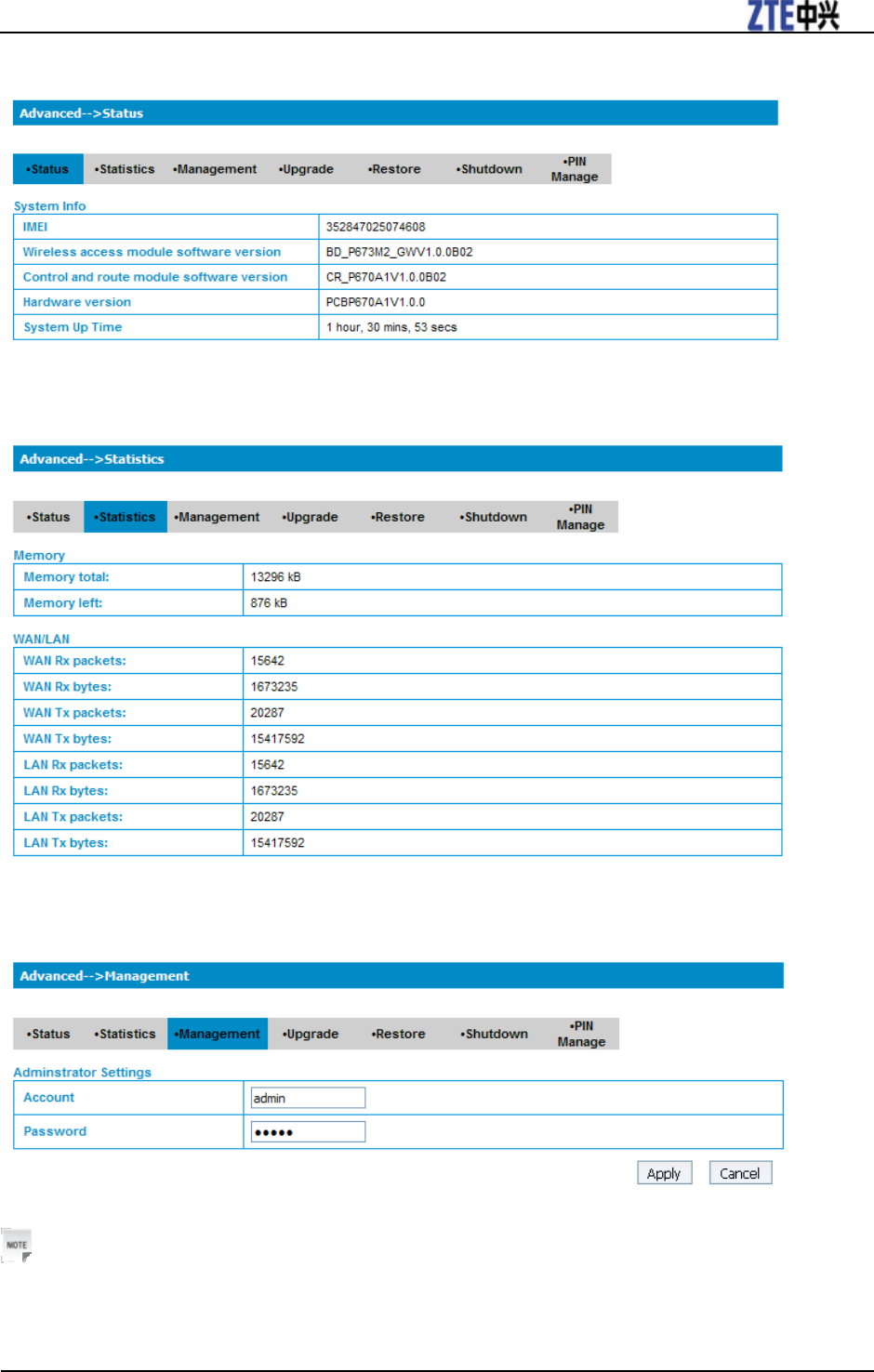 Select Advanced > Management, the administrator settings information is shown in the following figure: