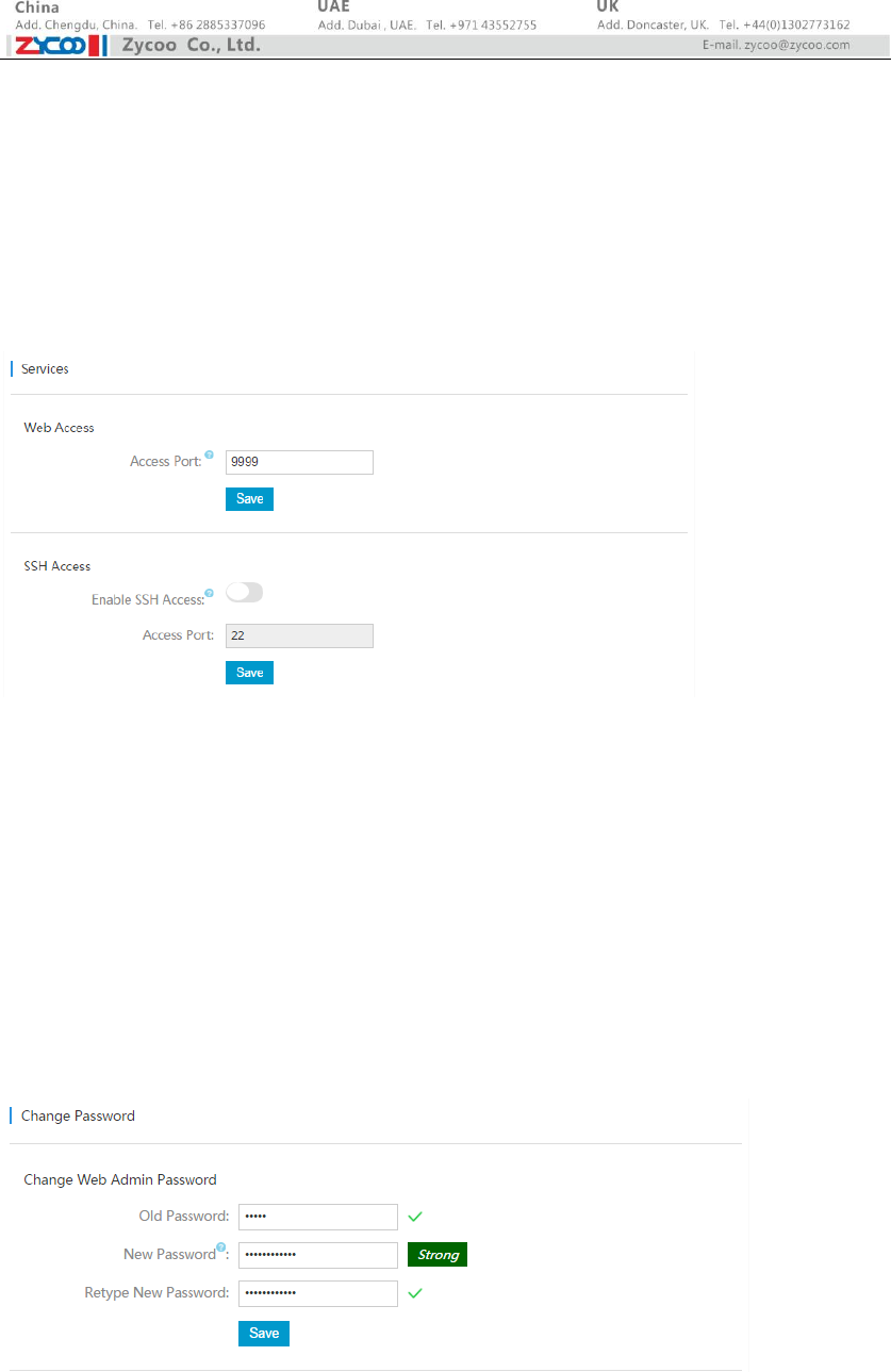 On Administration->Services page, you may change the EX16S Web GUI port number. And for SSH
