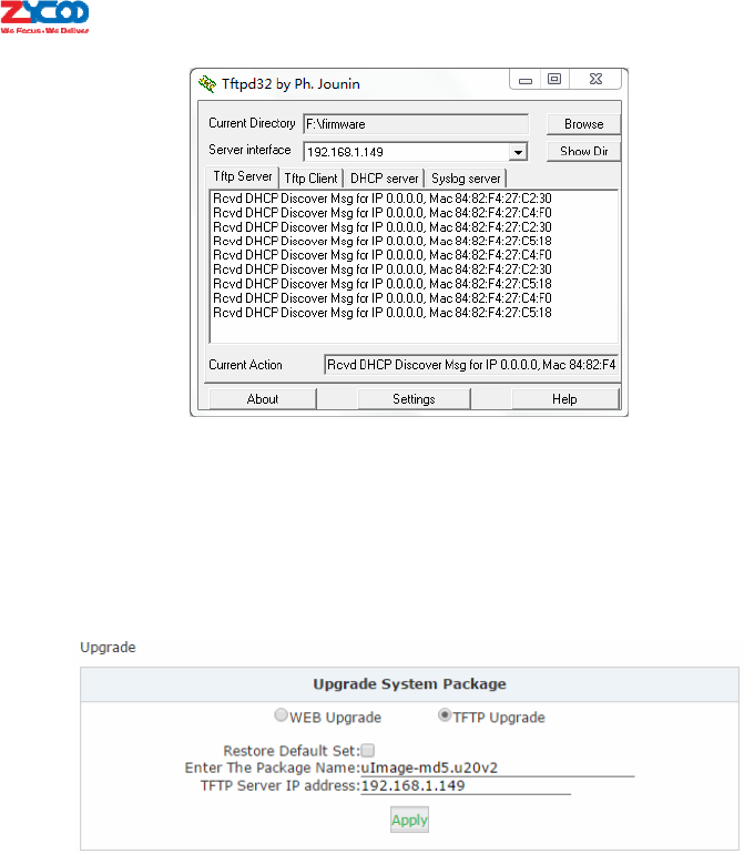 firmwarefilenameinthe“EnterThePackageName”blank,andinthe“TFTPServerIPaddress”