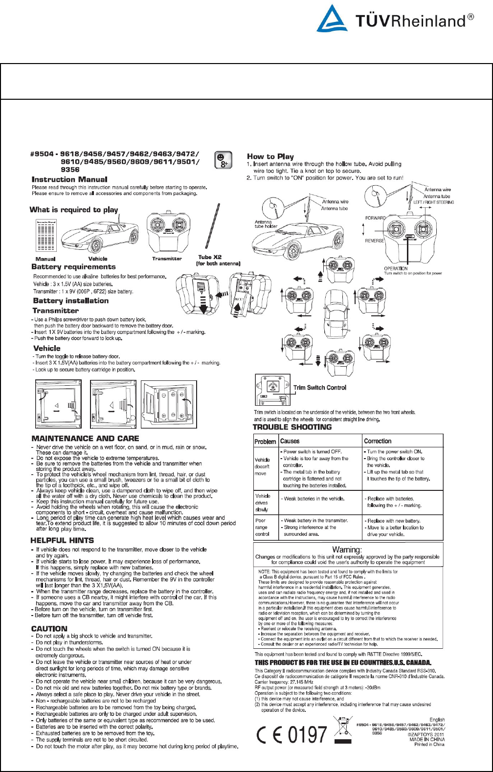 Zaptoys 9650-27TX RC Toy Transmitter User Manual 14026583 001 FCC A5