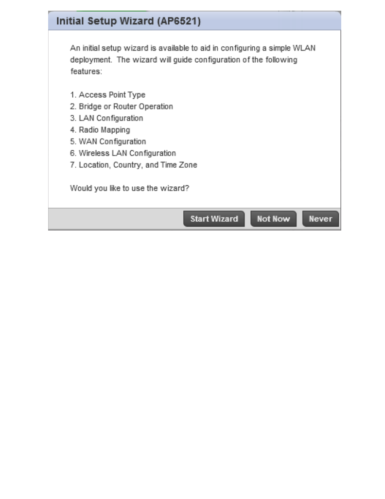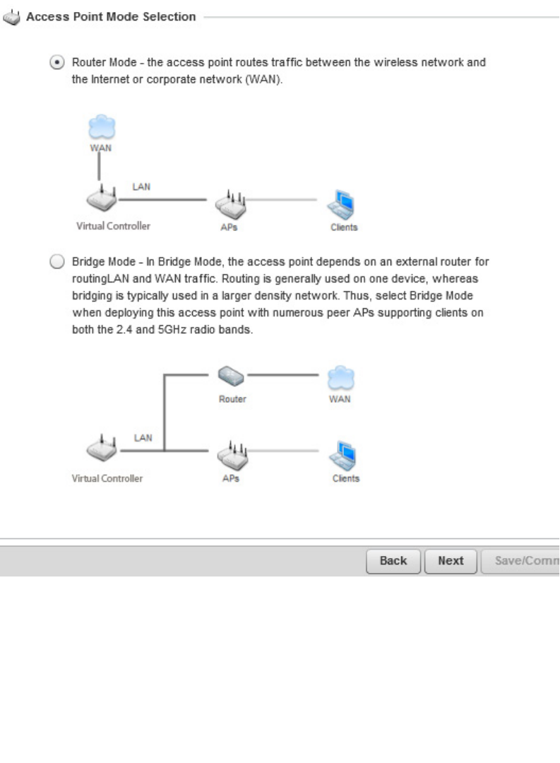 An AP-6521 Series access point utilizes a setup wizard to define its operational mode as either a