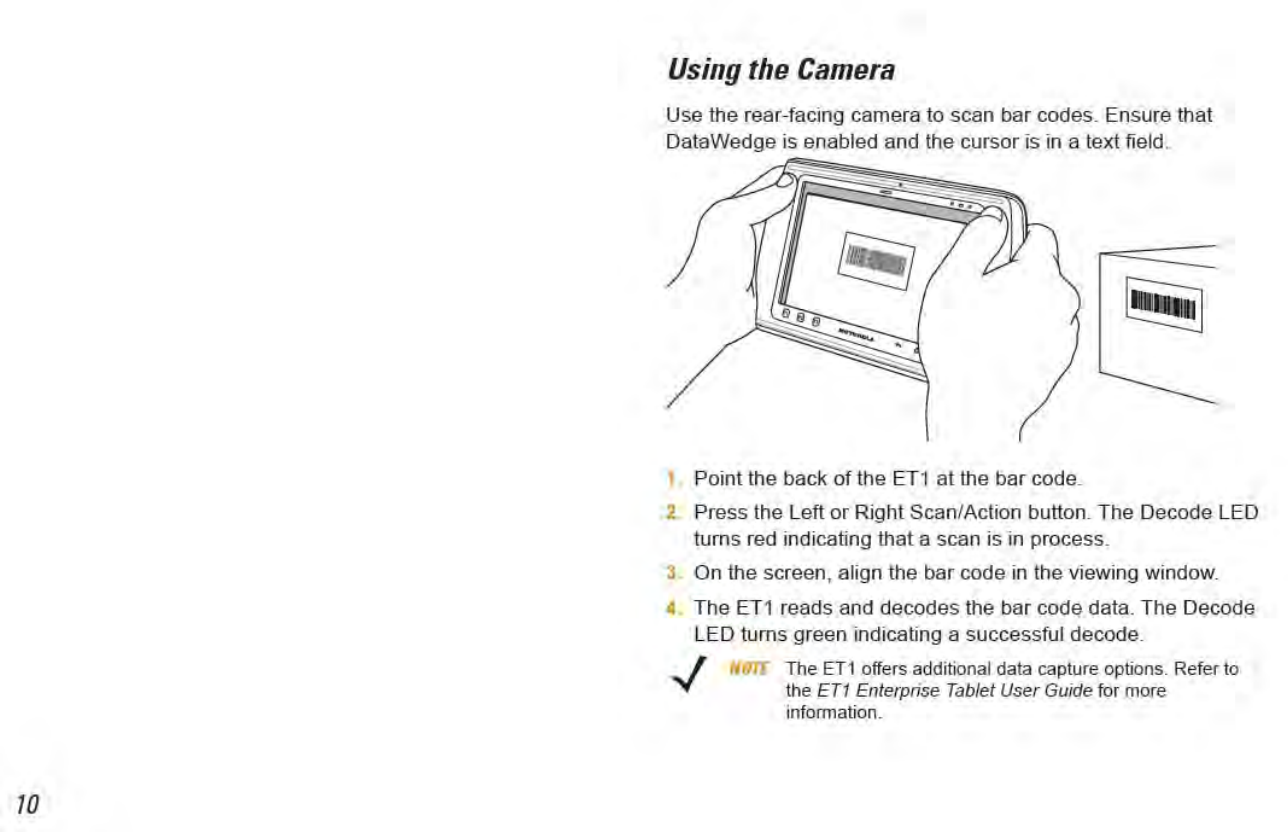 For more information about the ET1 Enterprise Tablet refer to the ET1 Enterprise Tablet User Guide and ET1 Enterprise Tablet Integrator Guide. For the