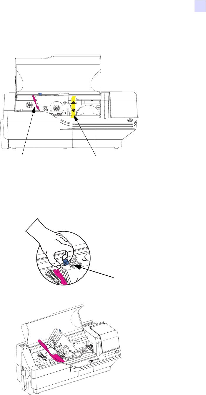 onto the take-up spindle. Make sure the ribbon comes off the top of the supply spindle and feeds to the top