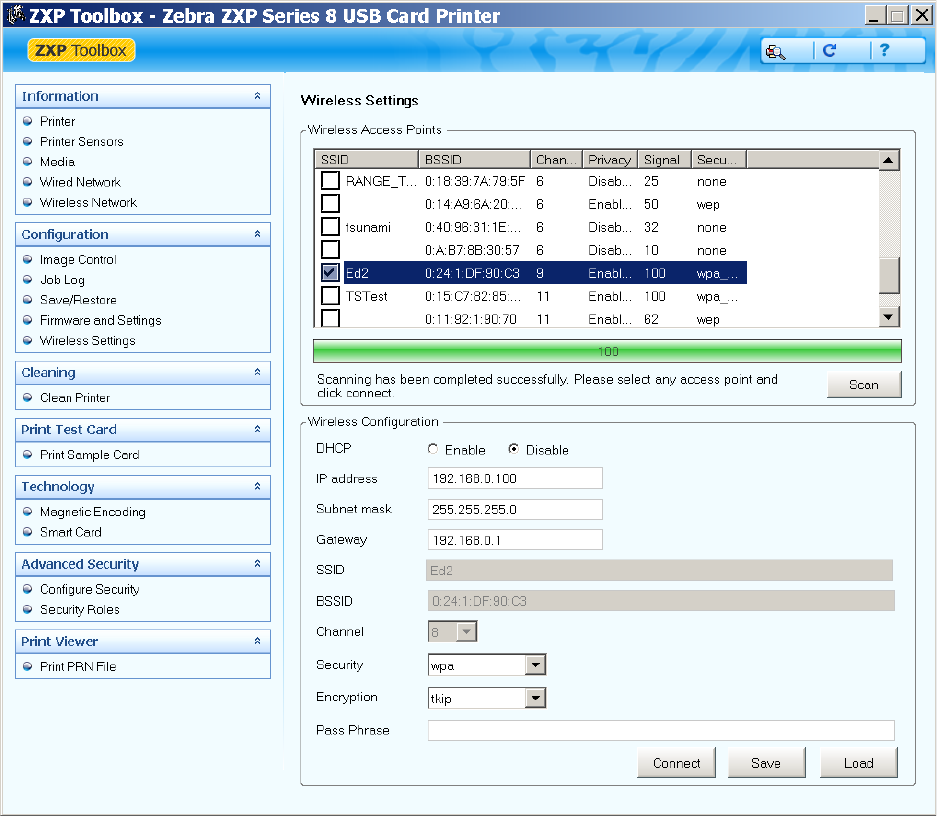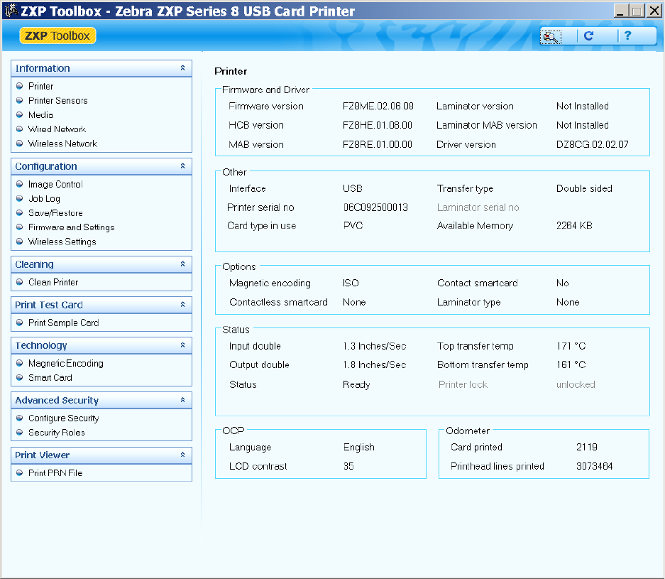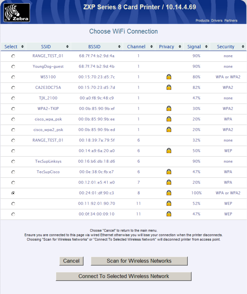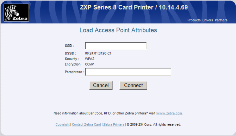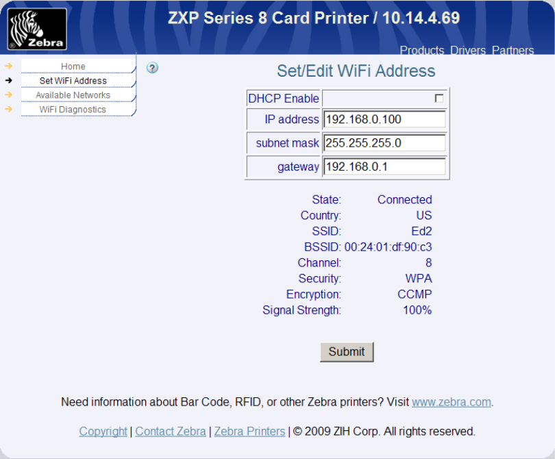 The Zebra ZXP Series 8 printer has an internal print server that supports both wired and