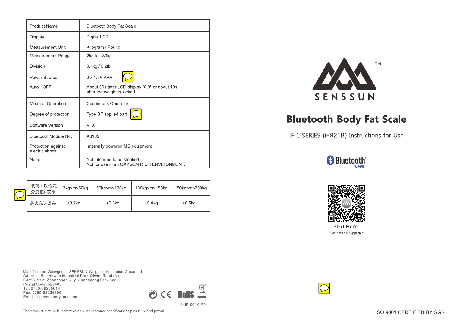 Zhongshan Camry Electronic IF921B Bluetooth Body Fat Scale User Manual 1
