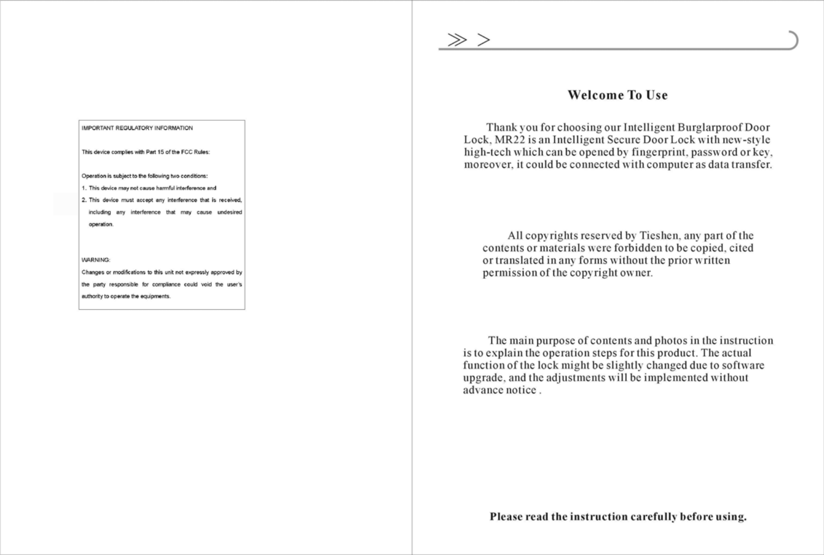 Zhongshan Tieshen Lock MR22 FINGER PRINT SECURITY LOCK User Manual
