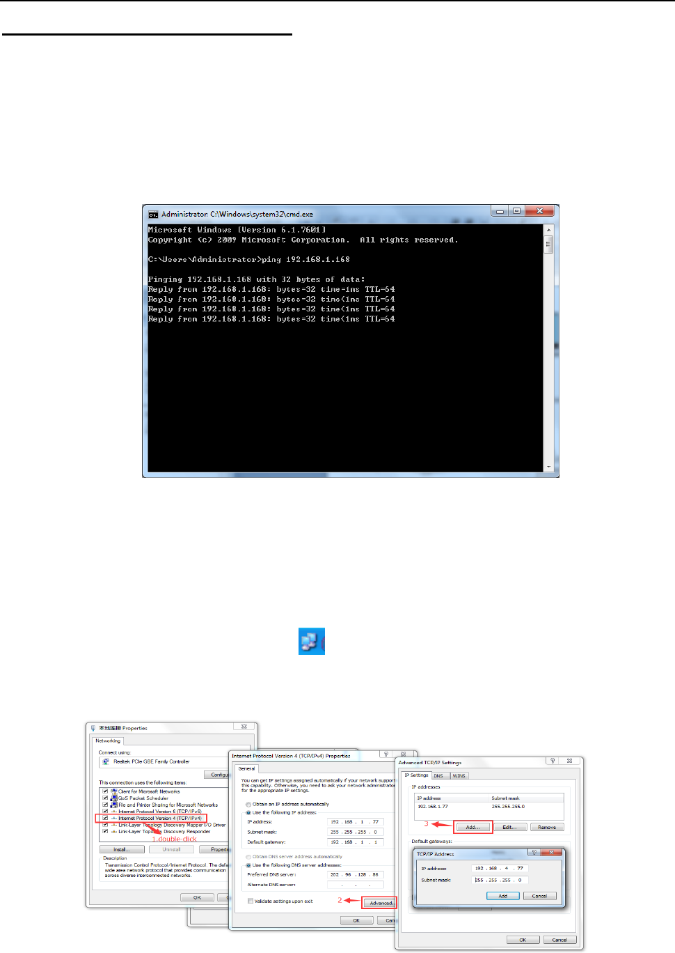 adaptor, and set the IP addresses of the PC and IP camera in one network segment. The IP camera will