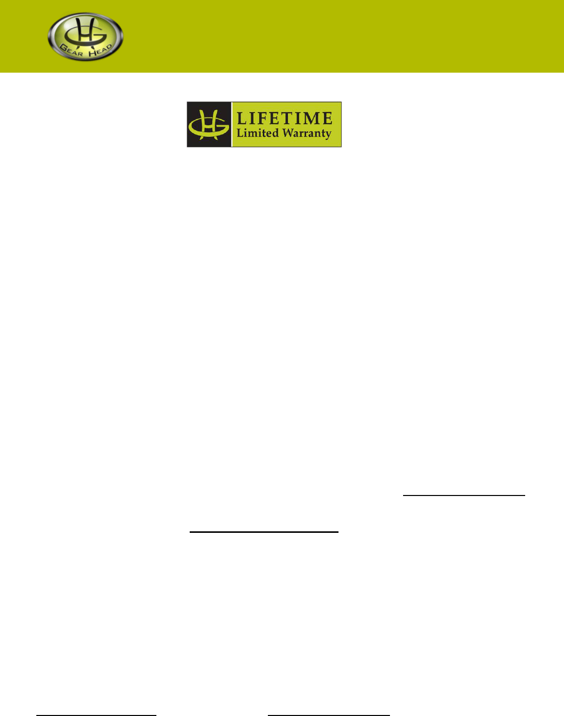 Any claim under this warranty must be made in writing to Gear Head, LLC, within 30 days
