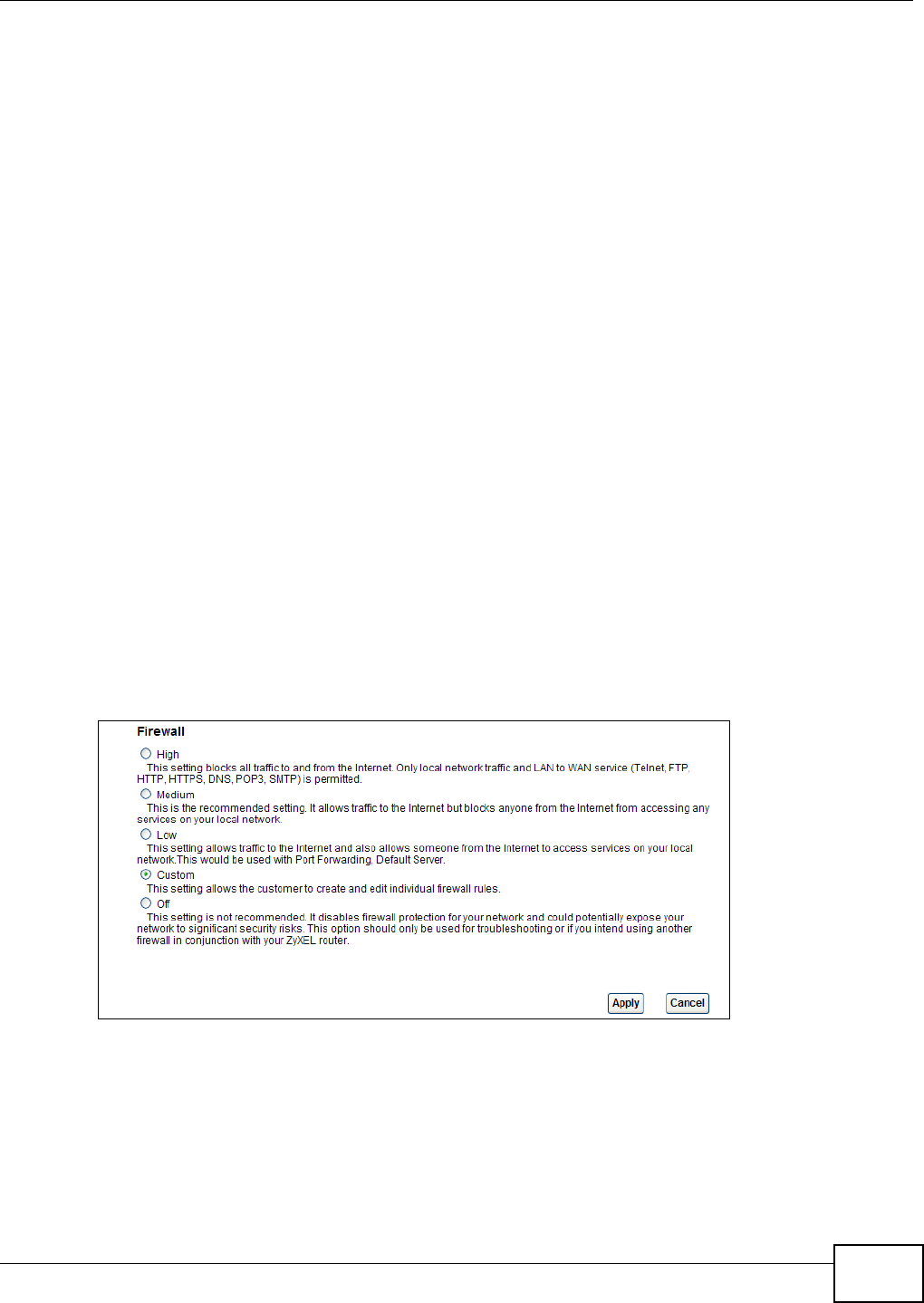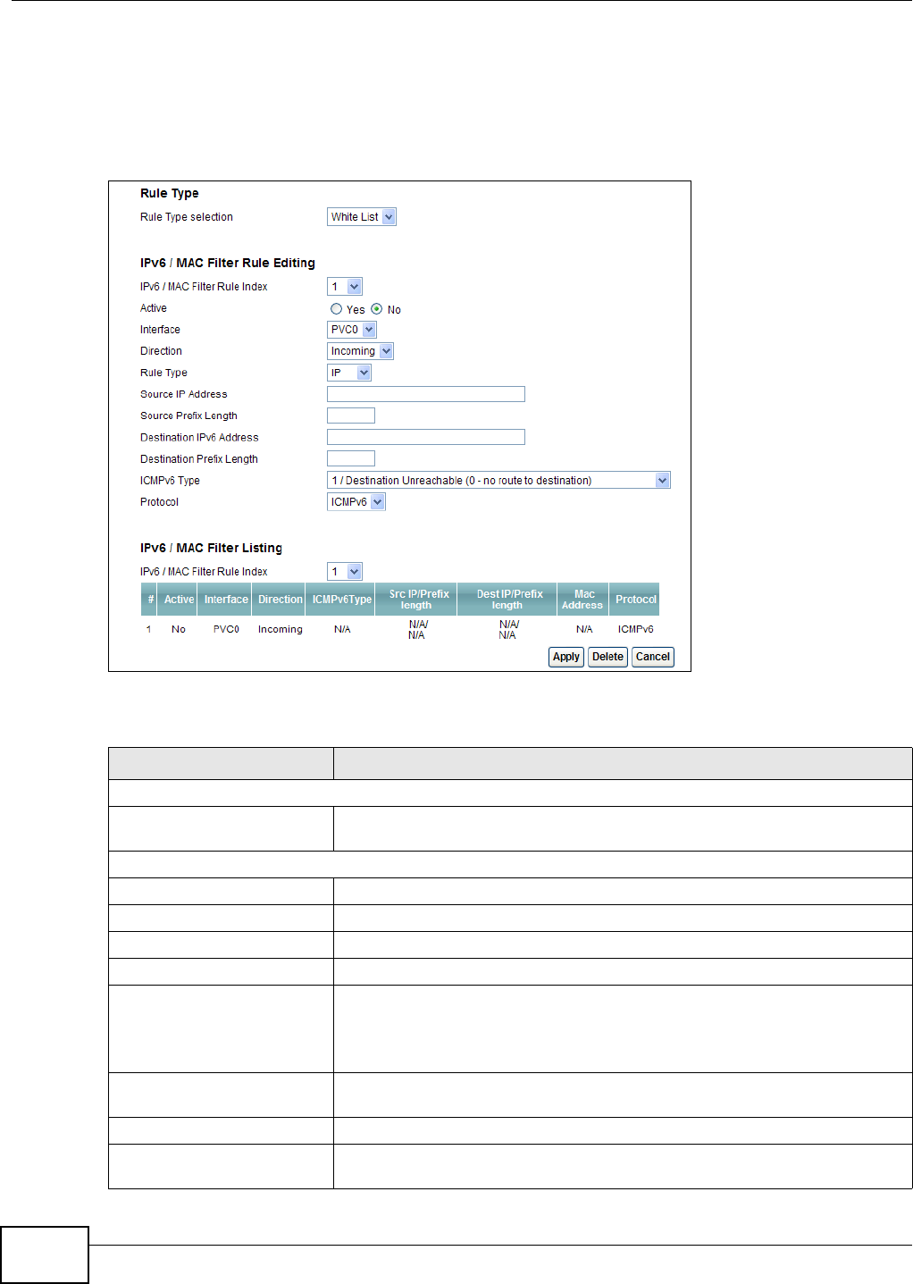 •Use the IPv6/MAC Filter screen (Section 14.3 on page 170) to create IPv6 and MAC filter rules.