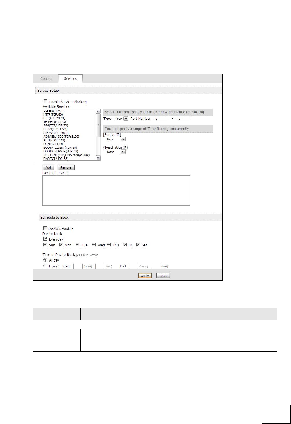 Blocking Select this to activate service blocking. The Schedule to Block section
