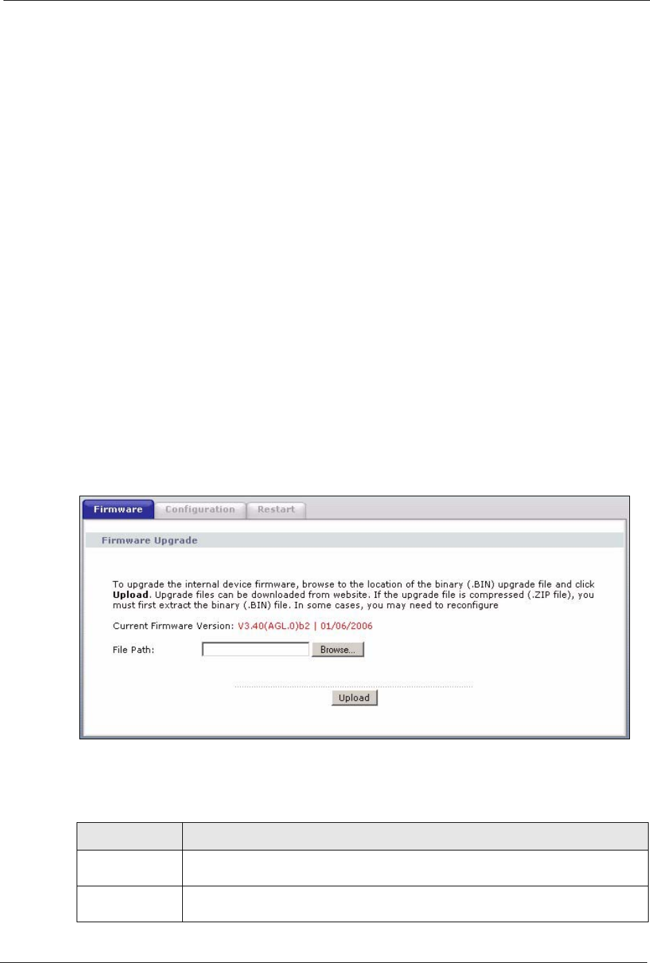 a.bin extension, for example, "ZyXEL Device.bin". The upload process uses HTTP (Hypertext