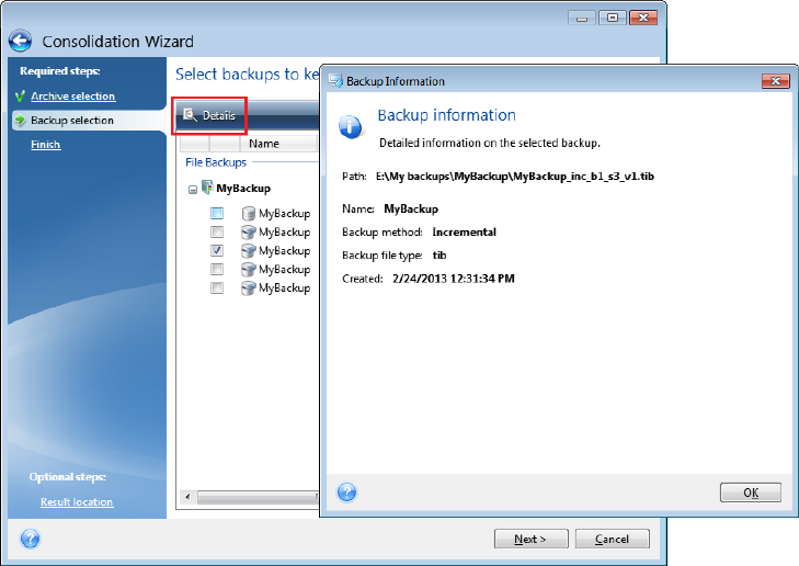 backup version, the selected incremental