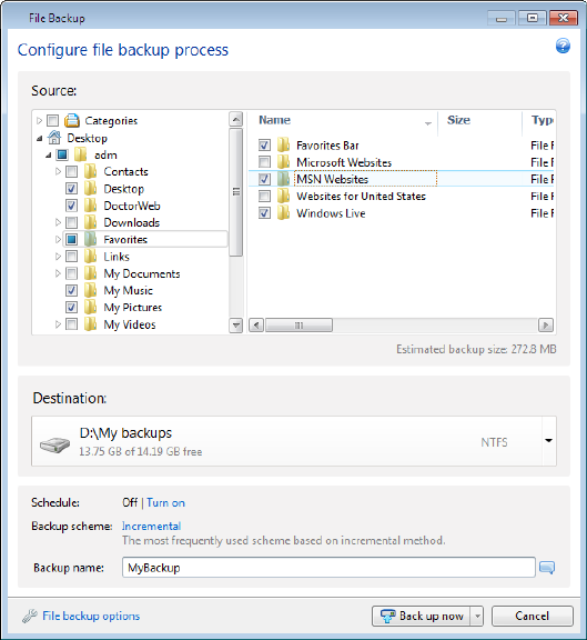 the data selected to back up.