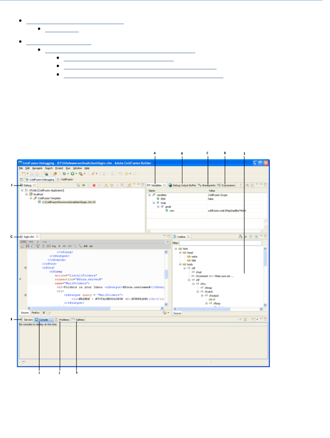 A. Variables view B. Debug output buffer view C. Breakpoints view D. Expressions view E. Outline view F. Debug