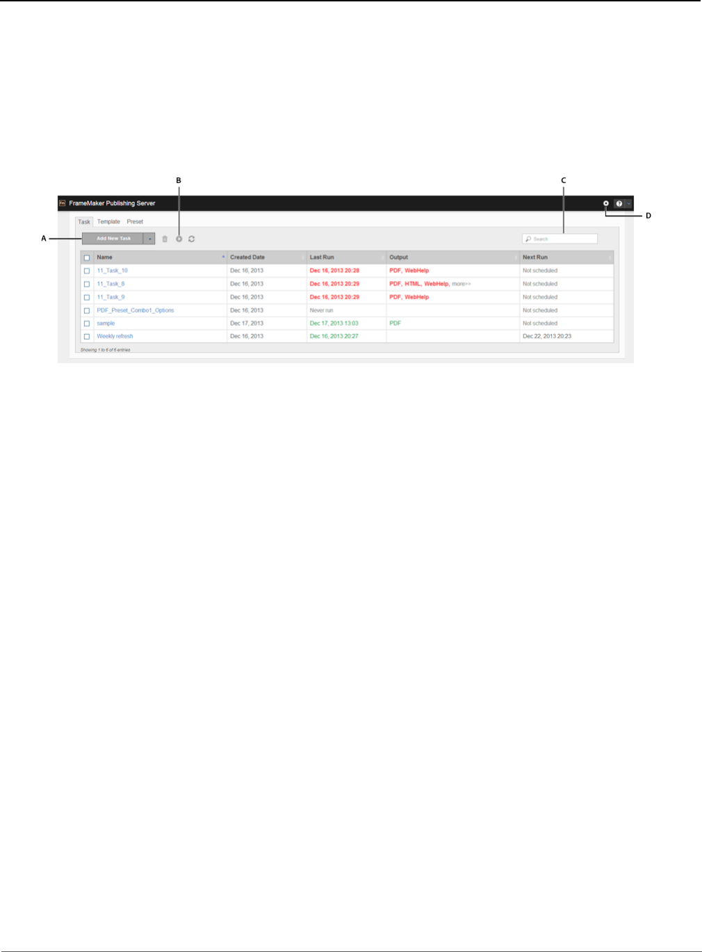 FrameMaker Publishing Server dashboard . . . . . . . . . . . . . . . . . . . . . . . . . . . . . . 7