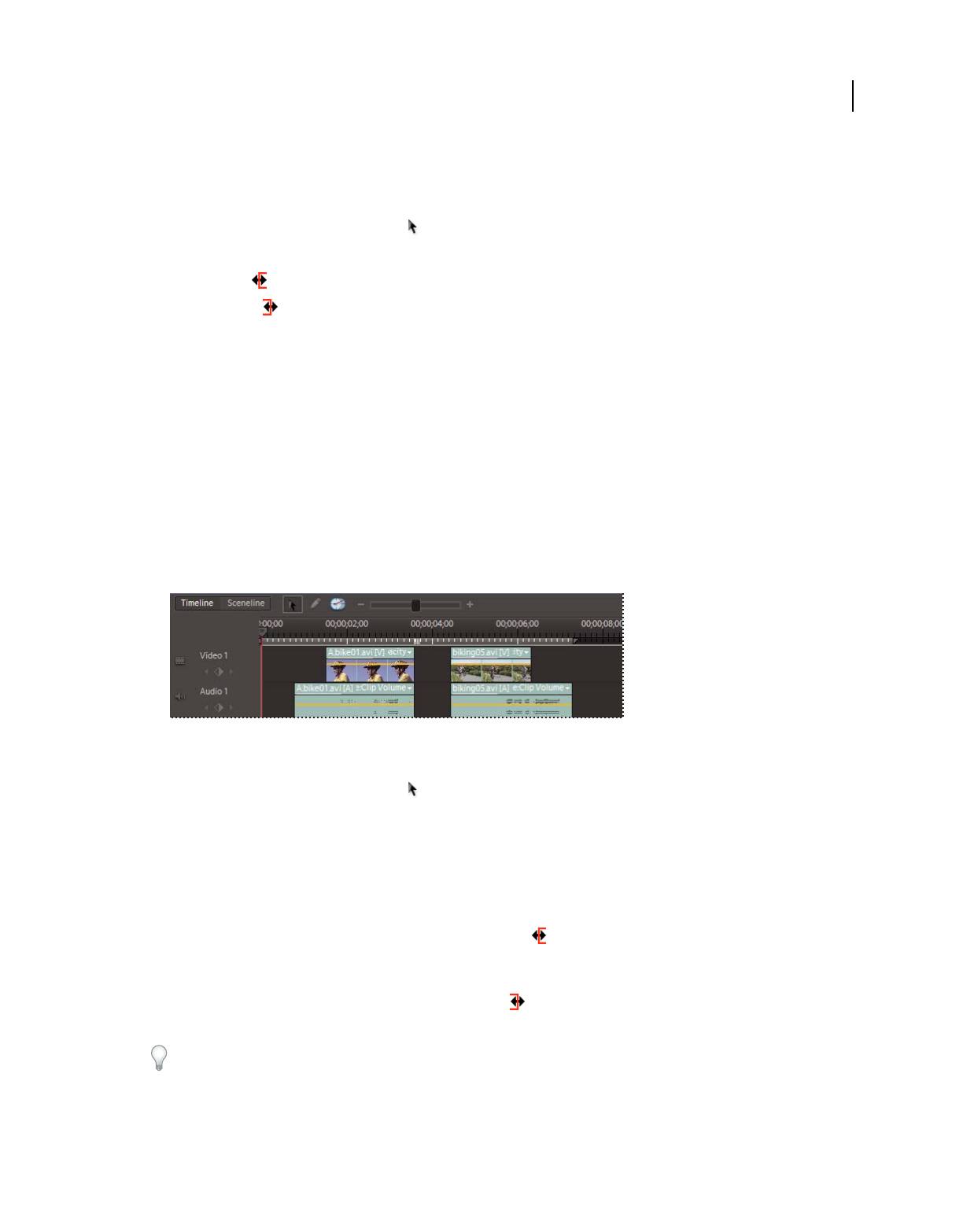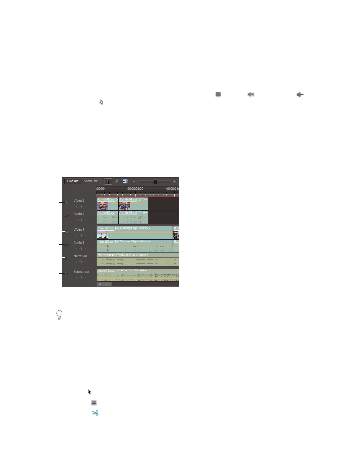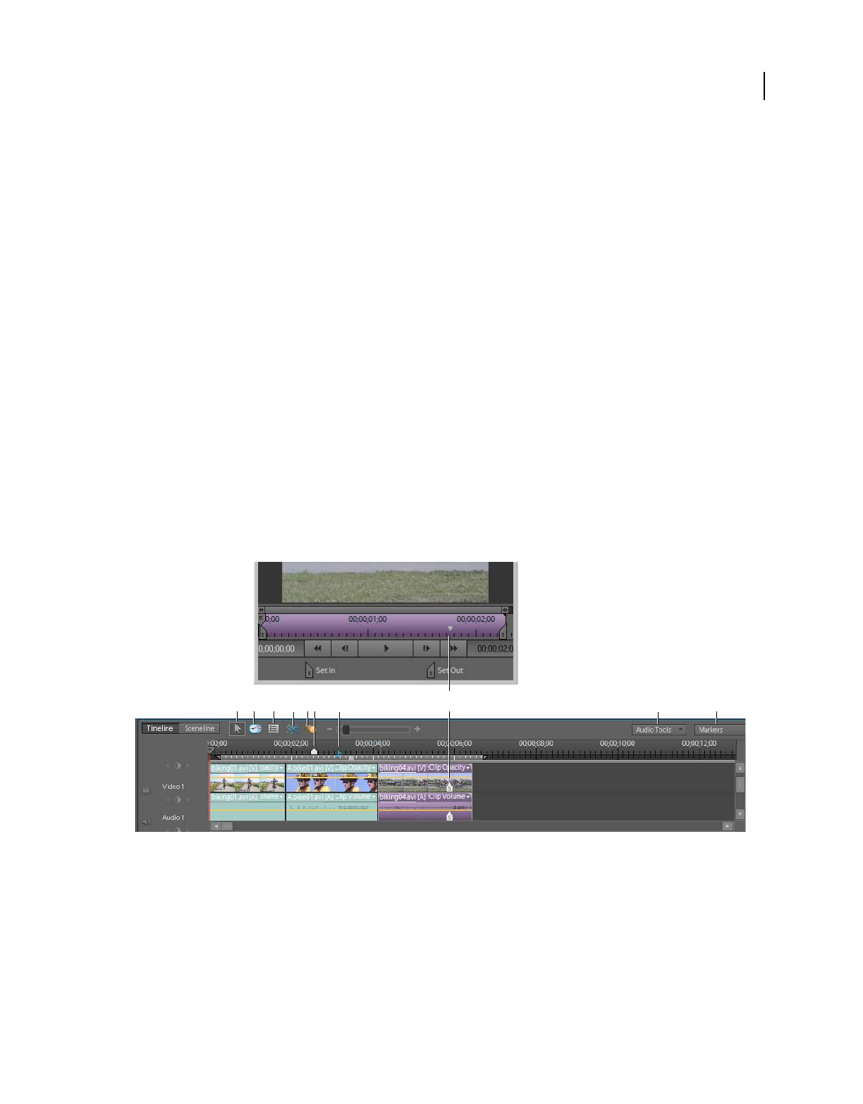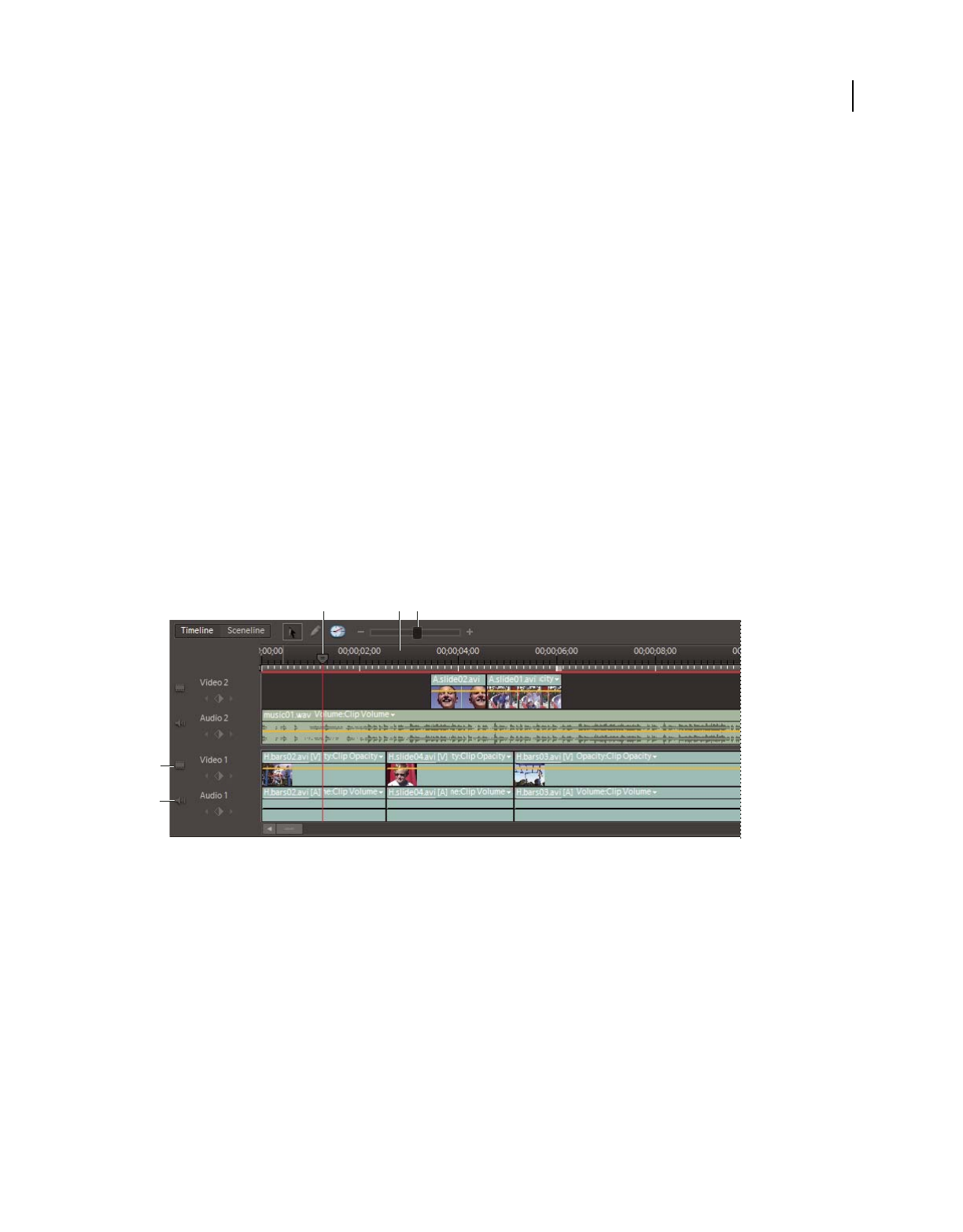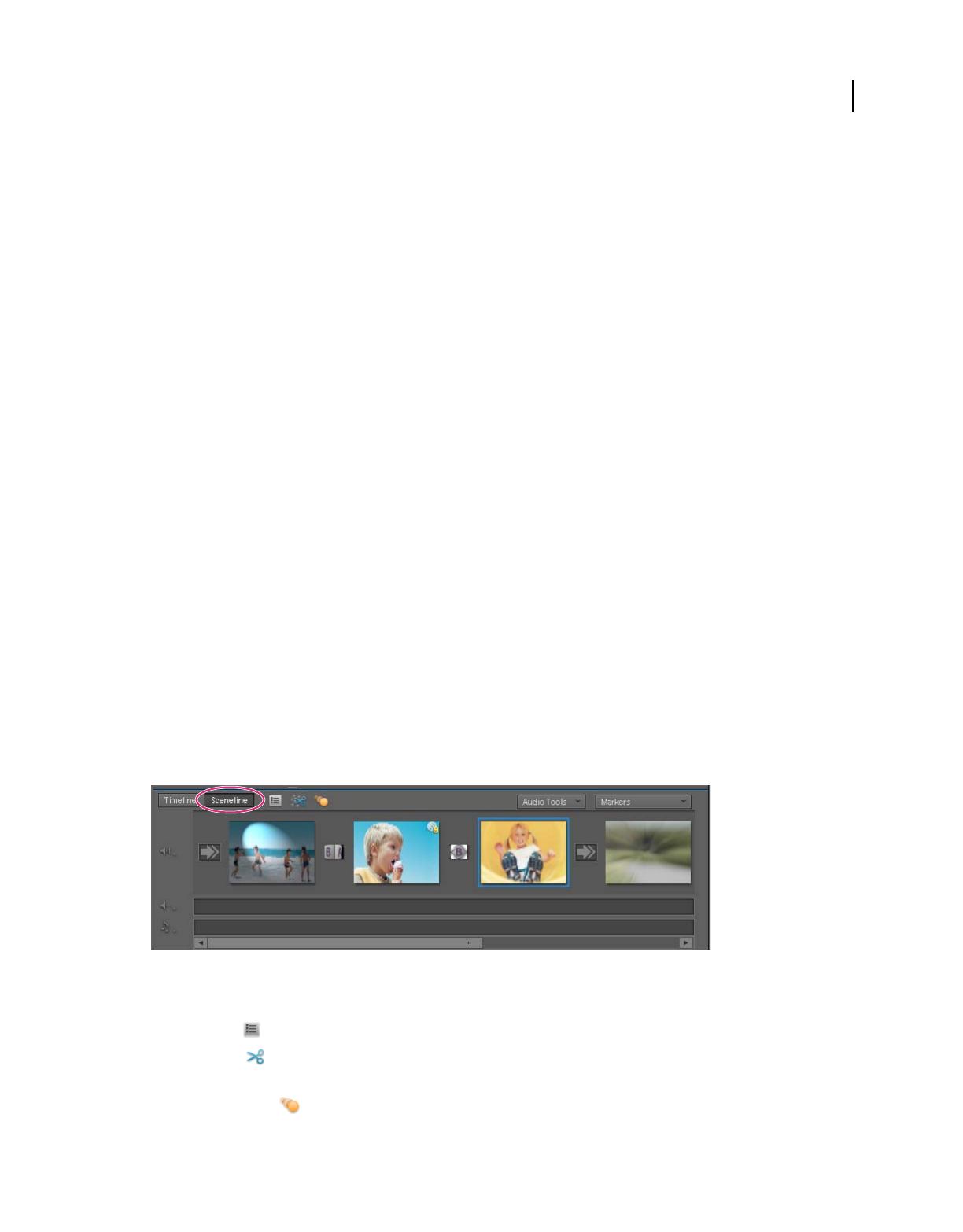 which clips appear. In Adobe Premiere Elements, storyboard-style editing occurs in the Sceneline. (See “Sceneline
