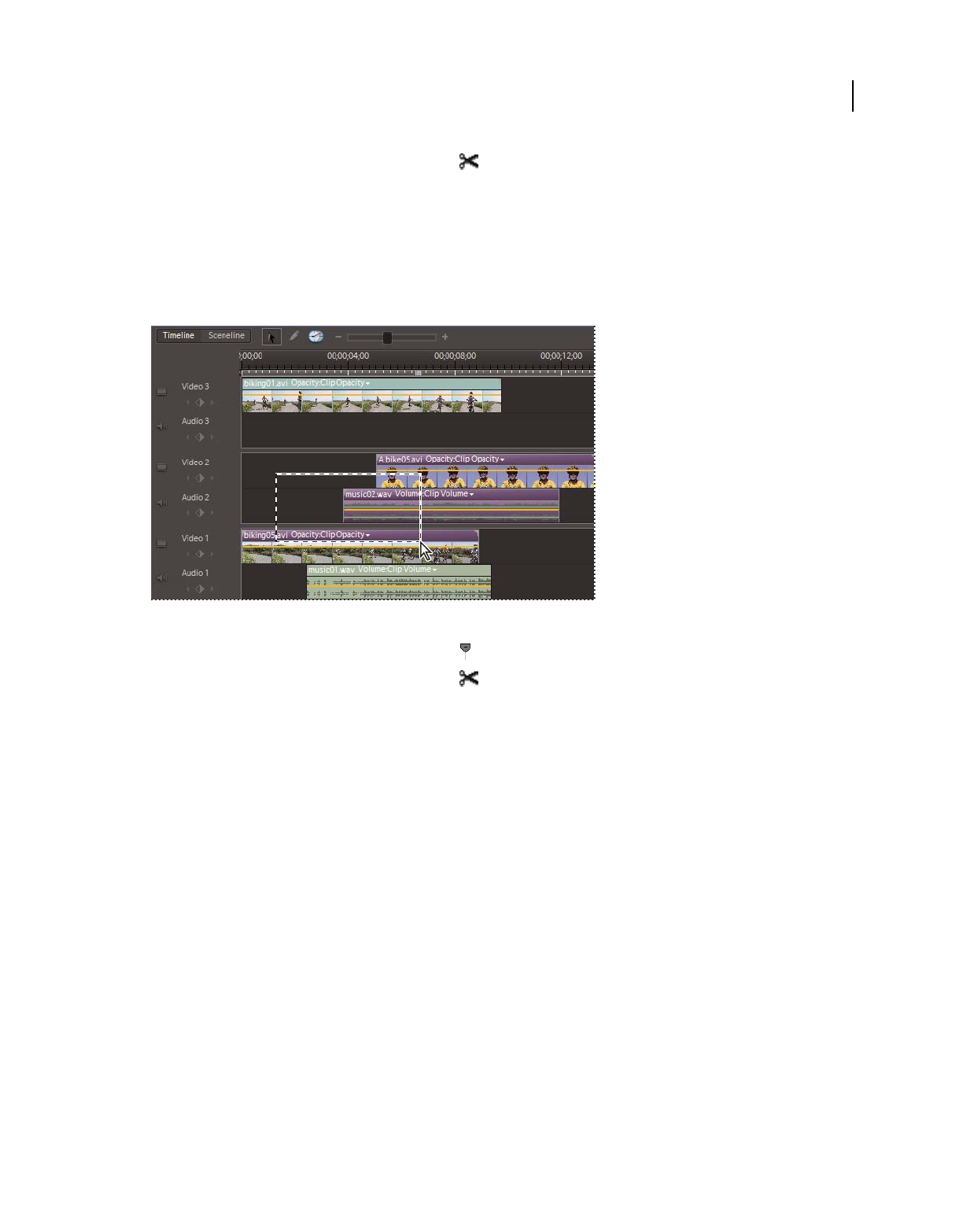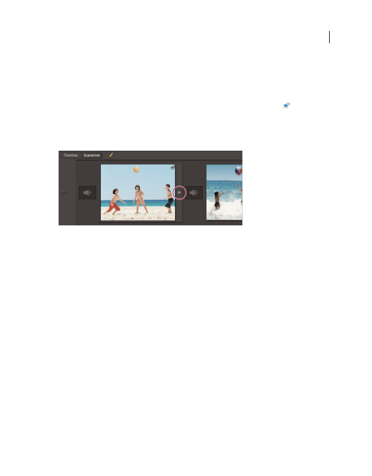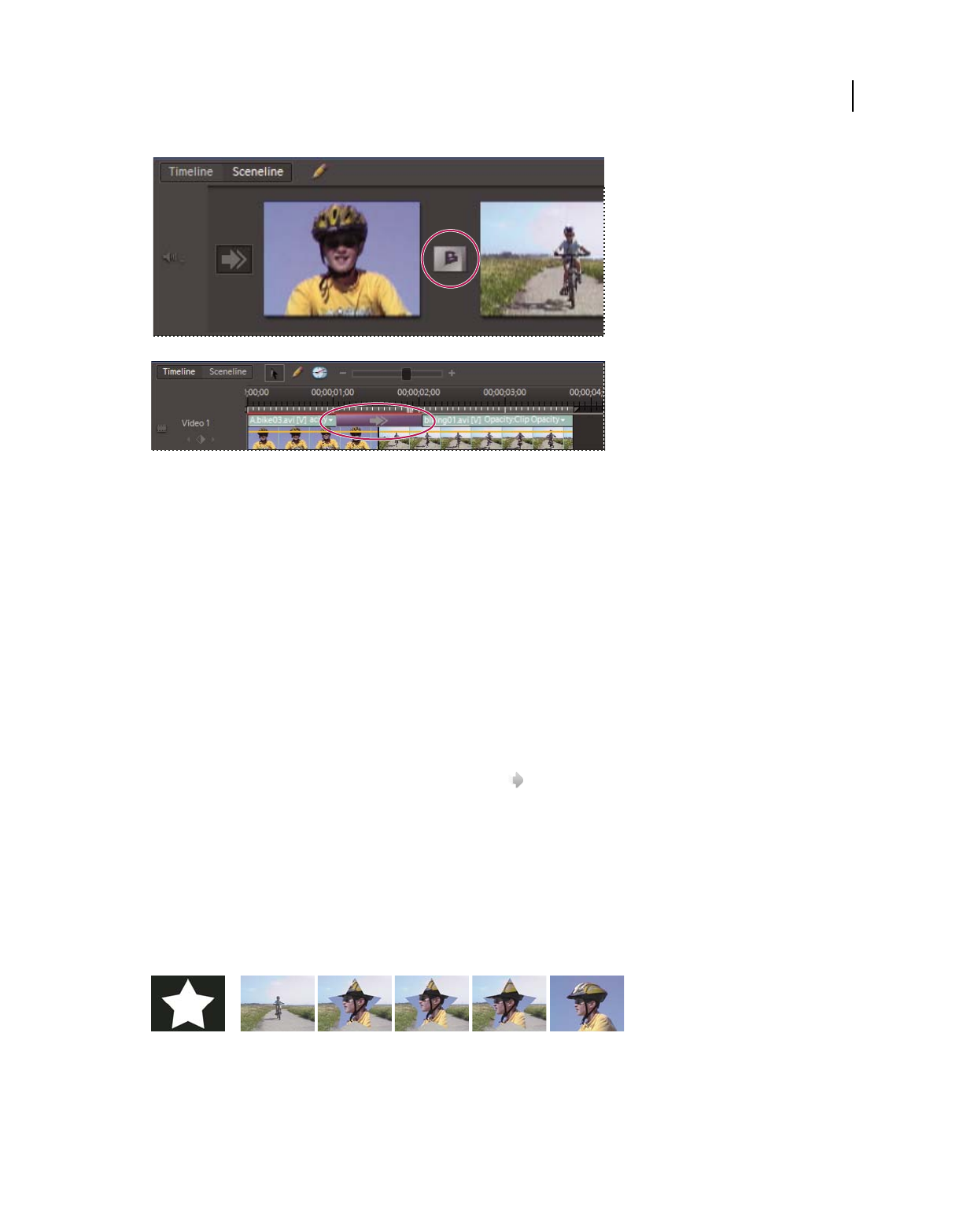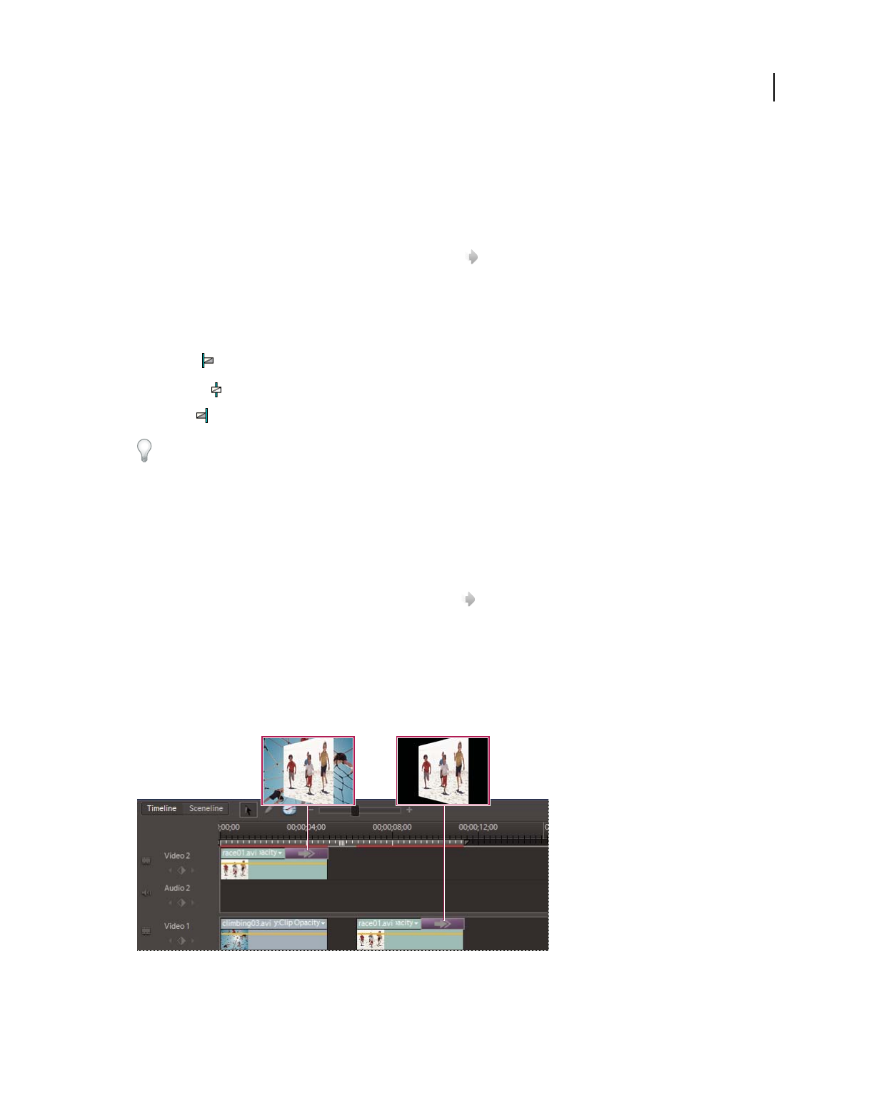 which clips appear. In Adobe Premiere Elements, storyboard-style editing occurs in the Sceneline. (See “Sceneline