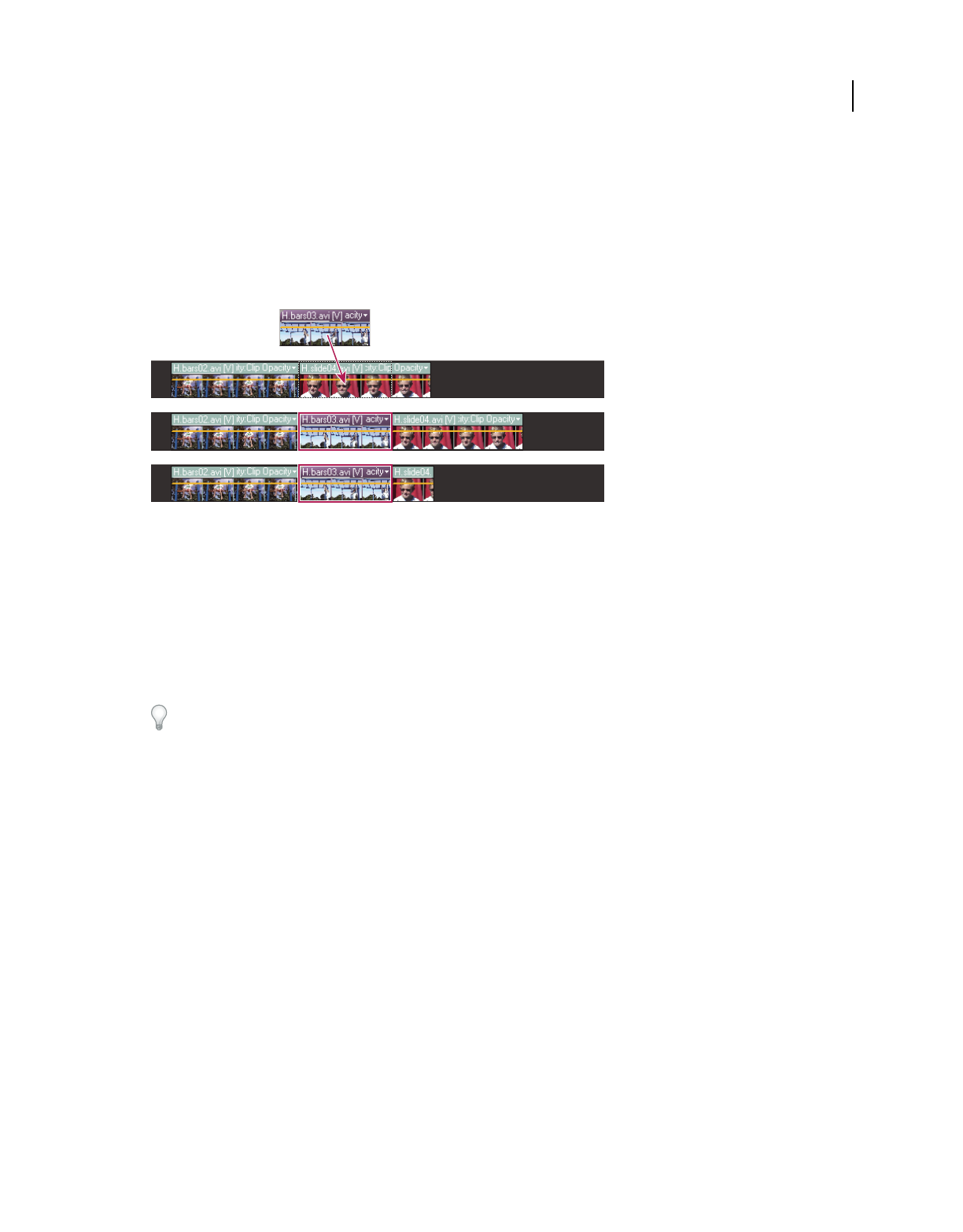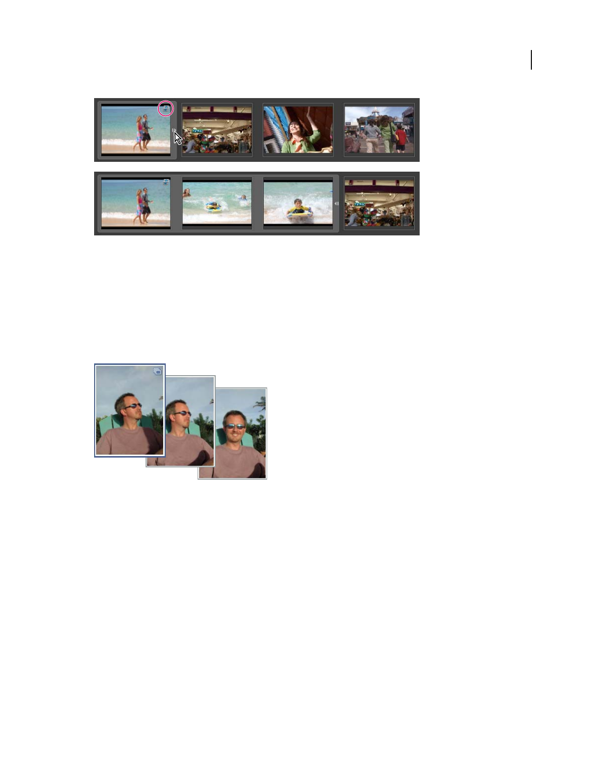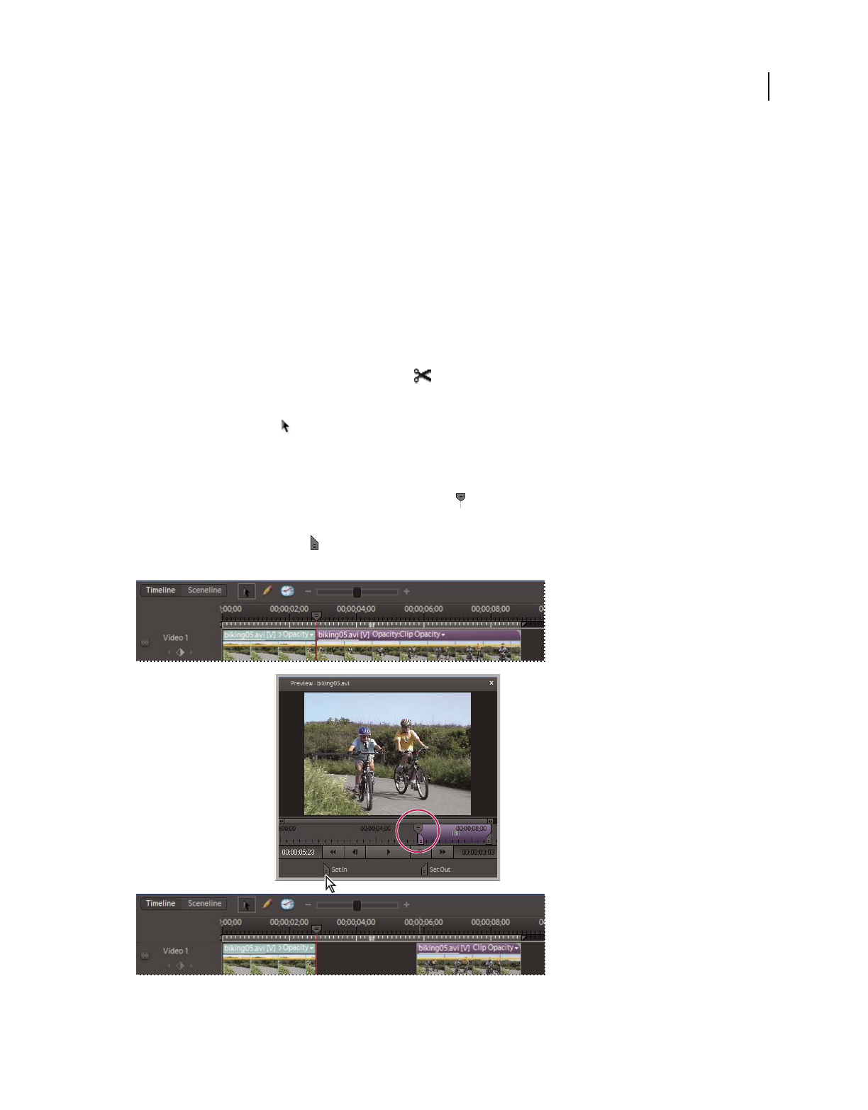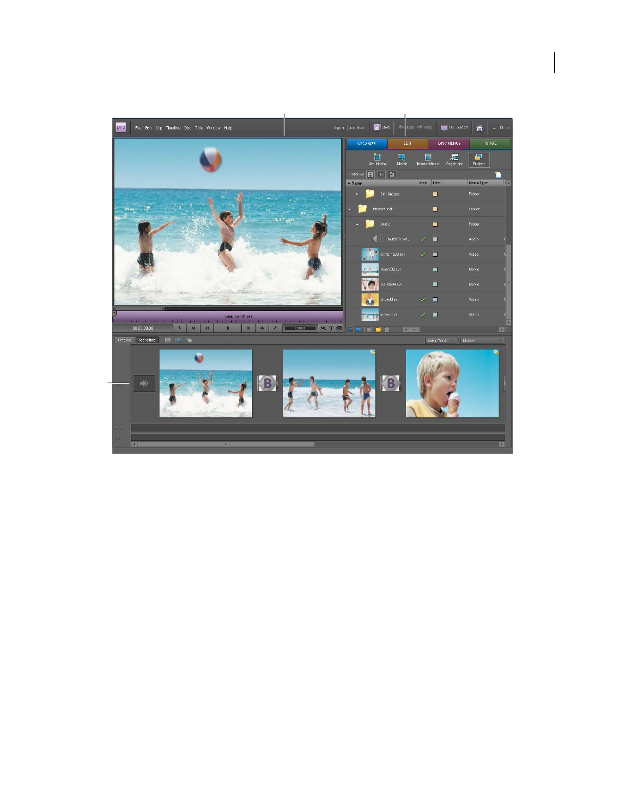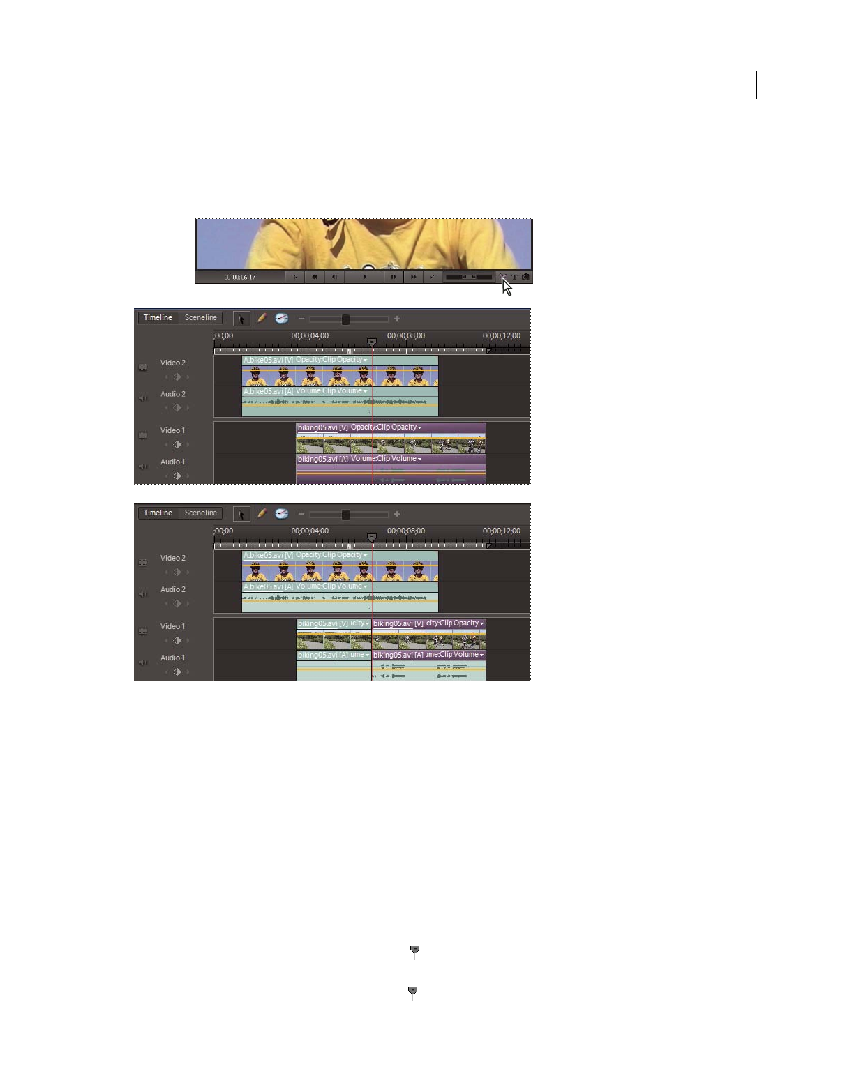 which clips appear. In Adobe Premiere Elements, storyboard-style editing occurs in the Sceneline. (See “Sceneline