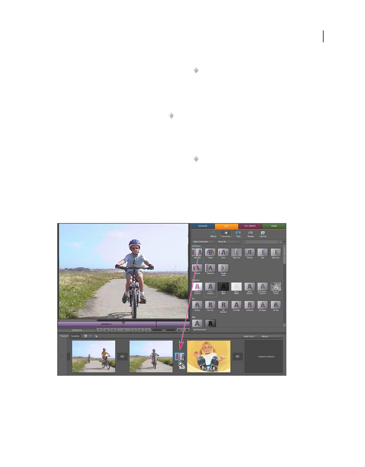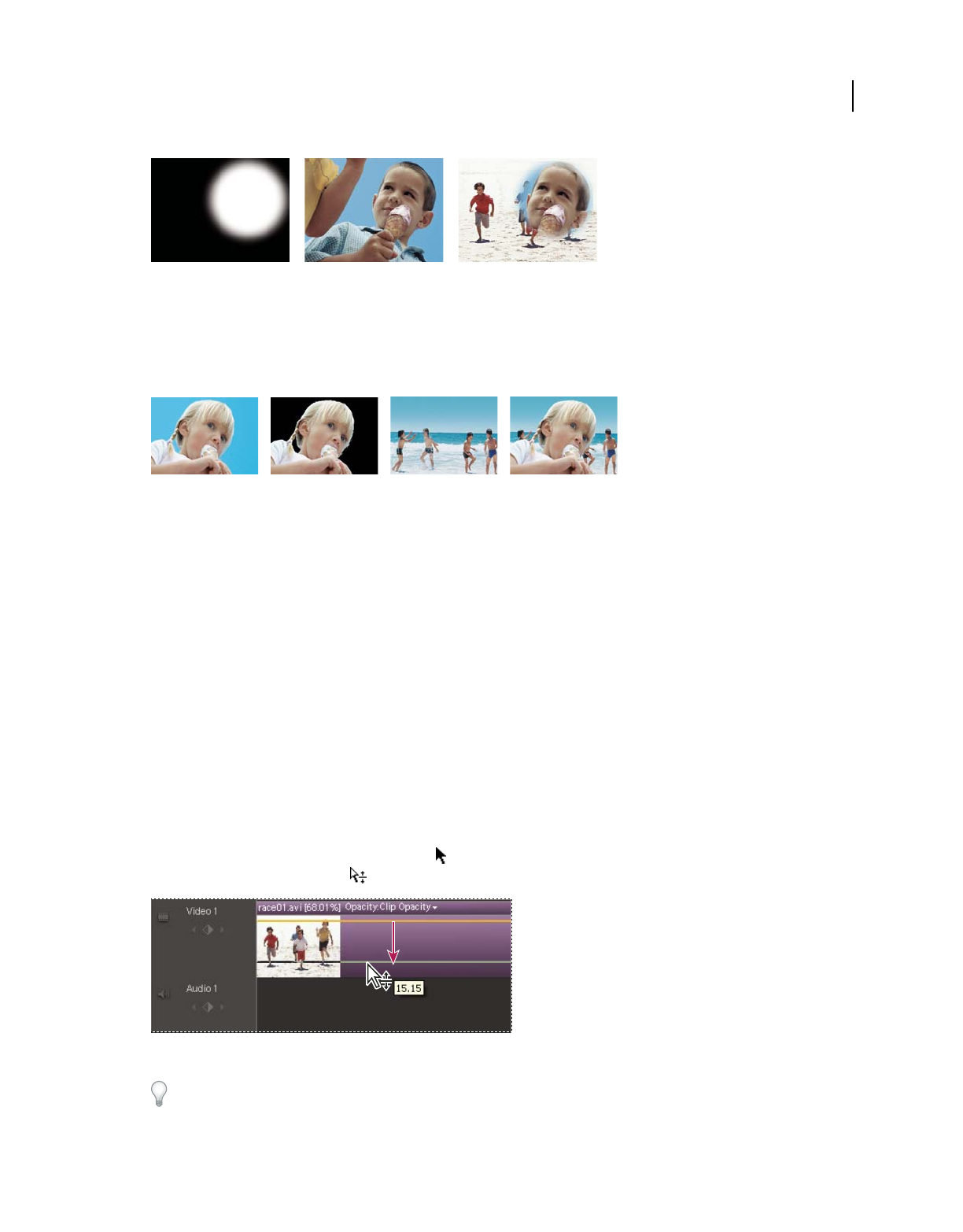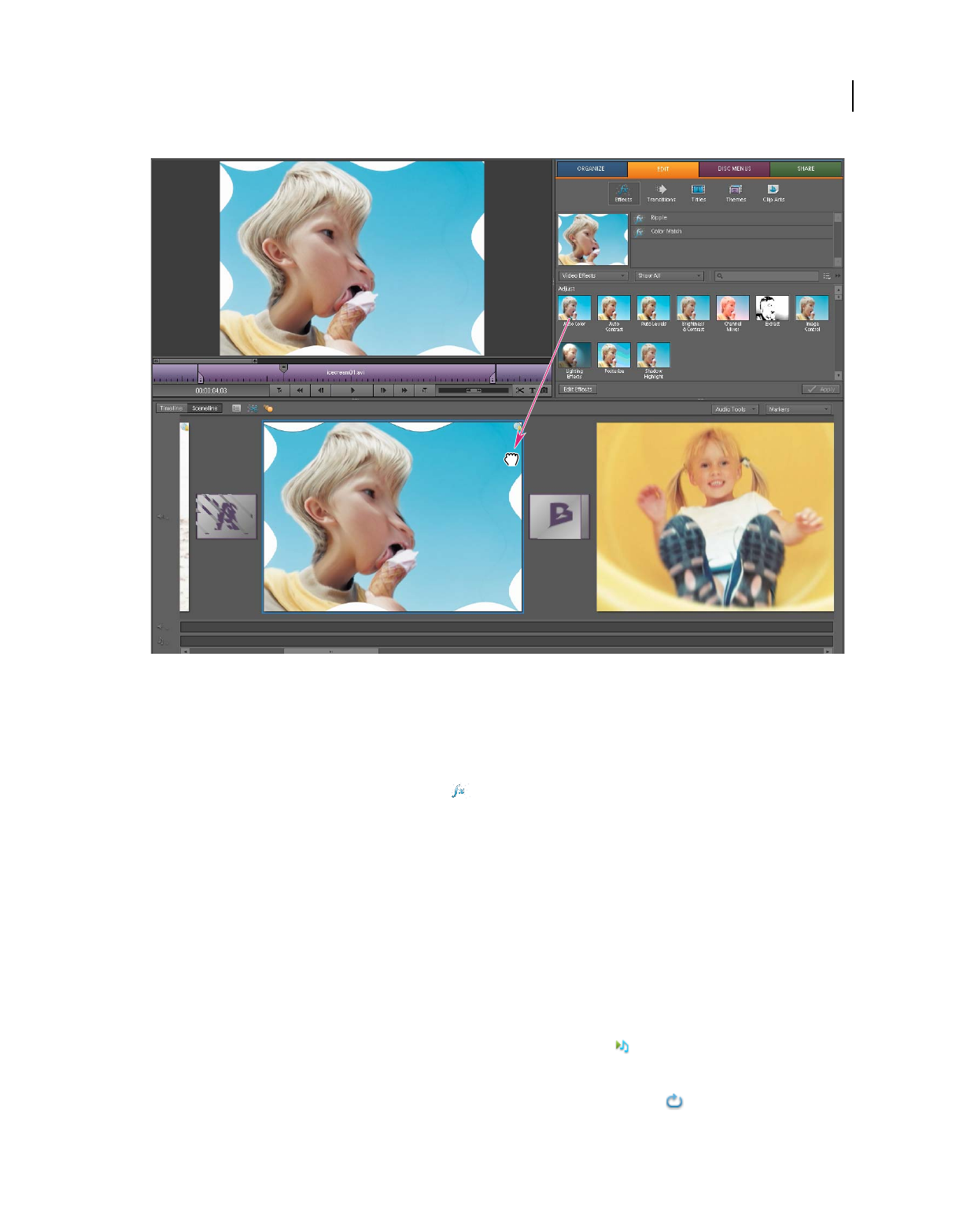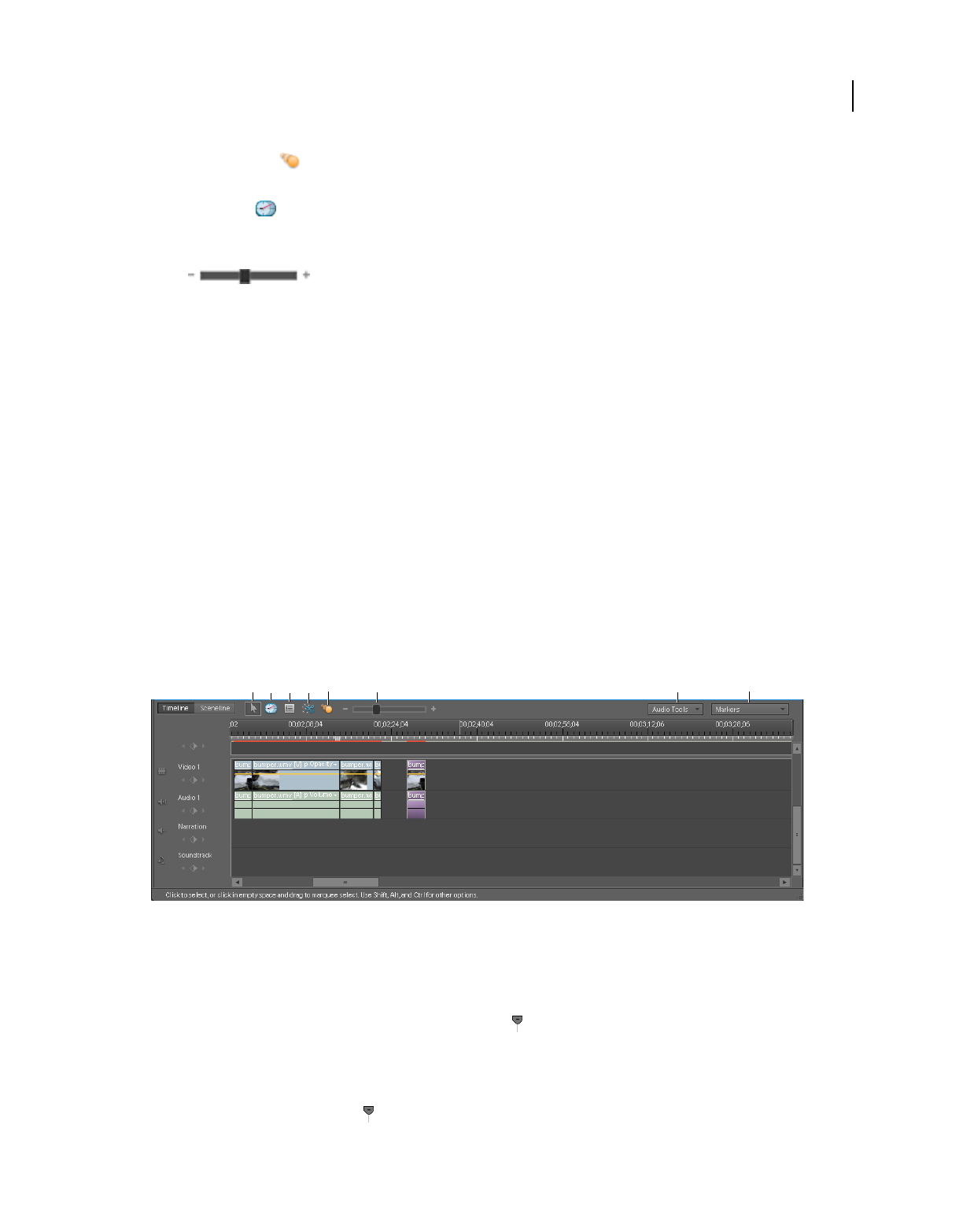 which clips appear. In Adobe Premiere Elements, storyboard-style editing occurs in the Sceneline. (See “Sceneline