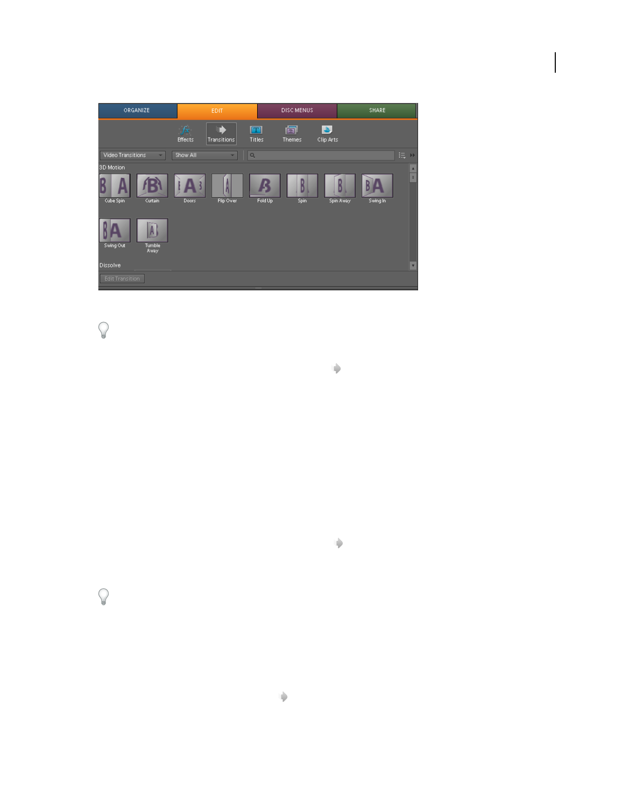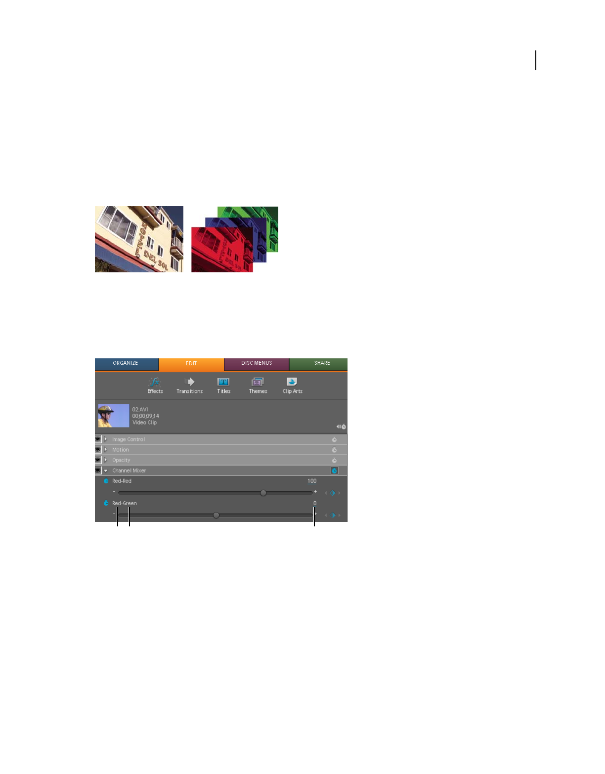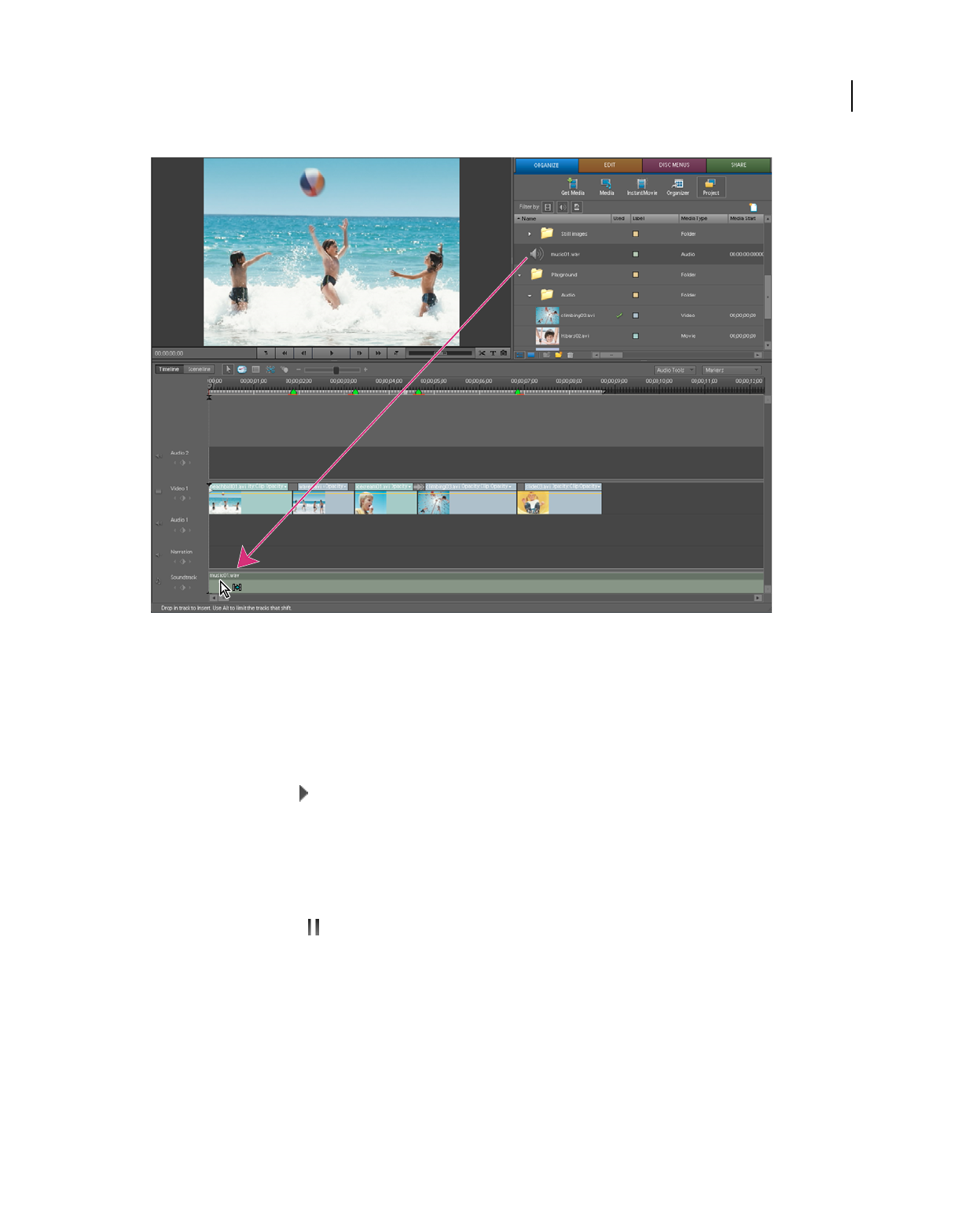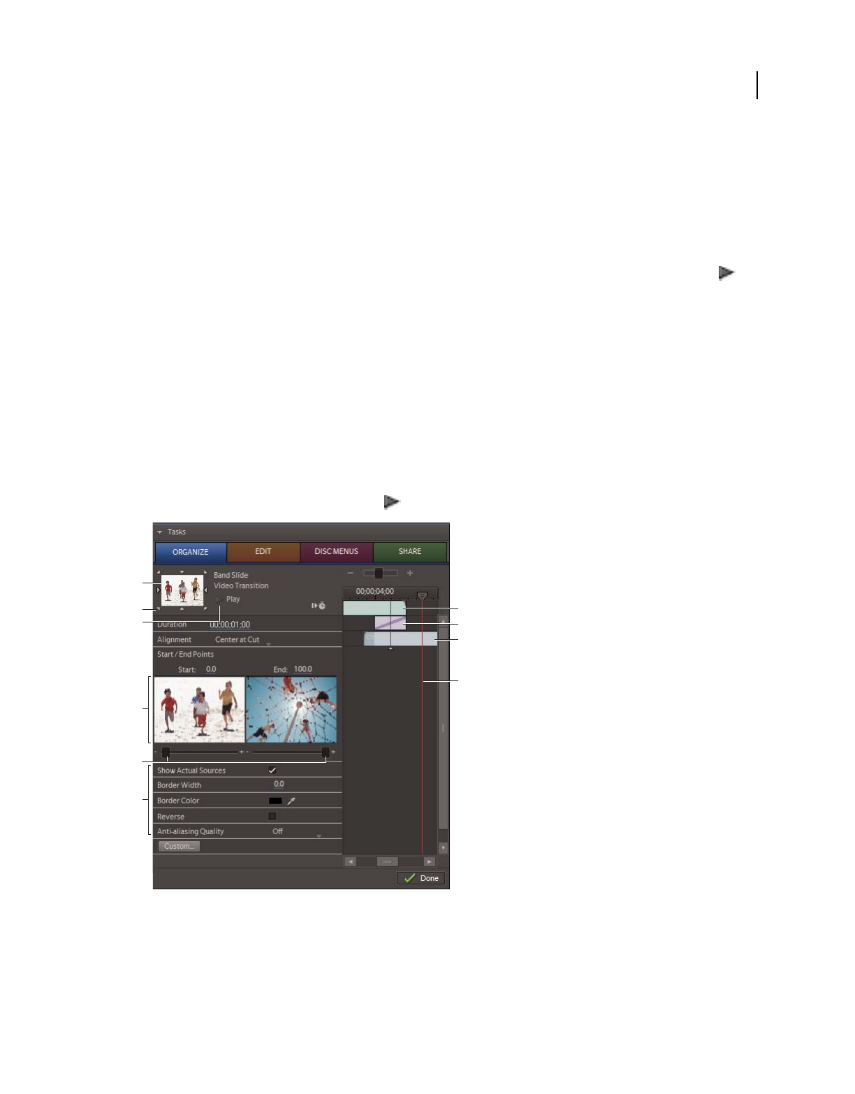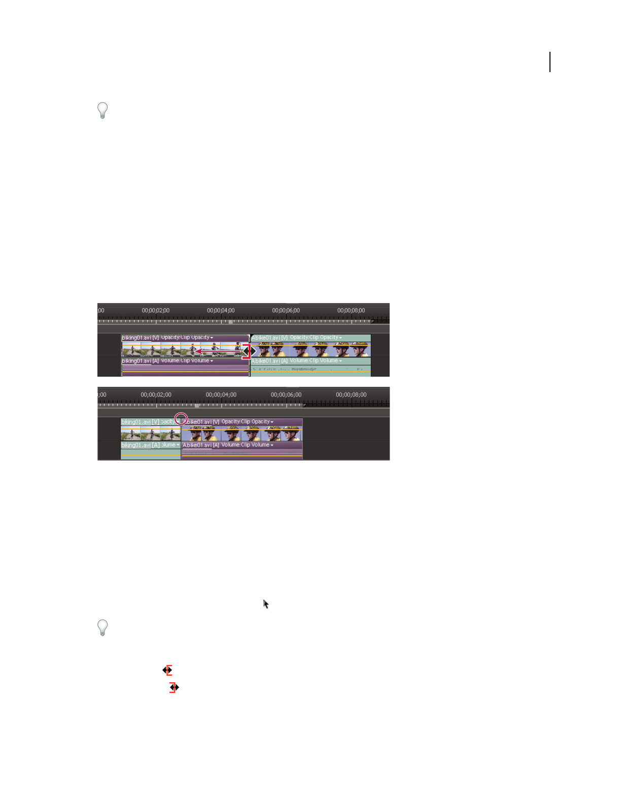 which clips appear. In Adobe Premiere Elements, storyboard-style editing occurs in the Sceneline. (See “Sceneline