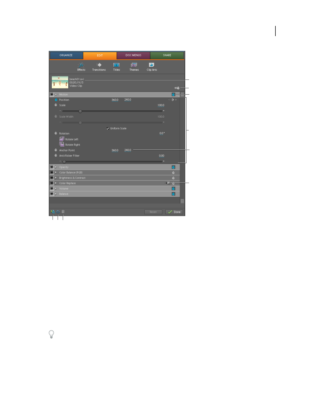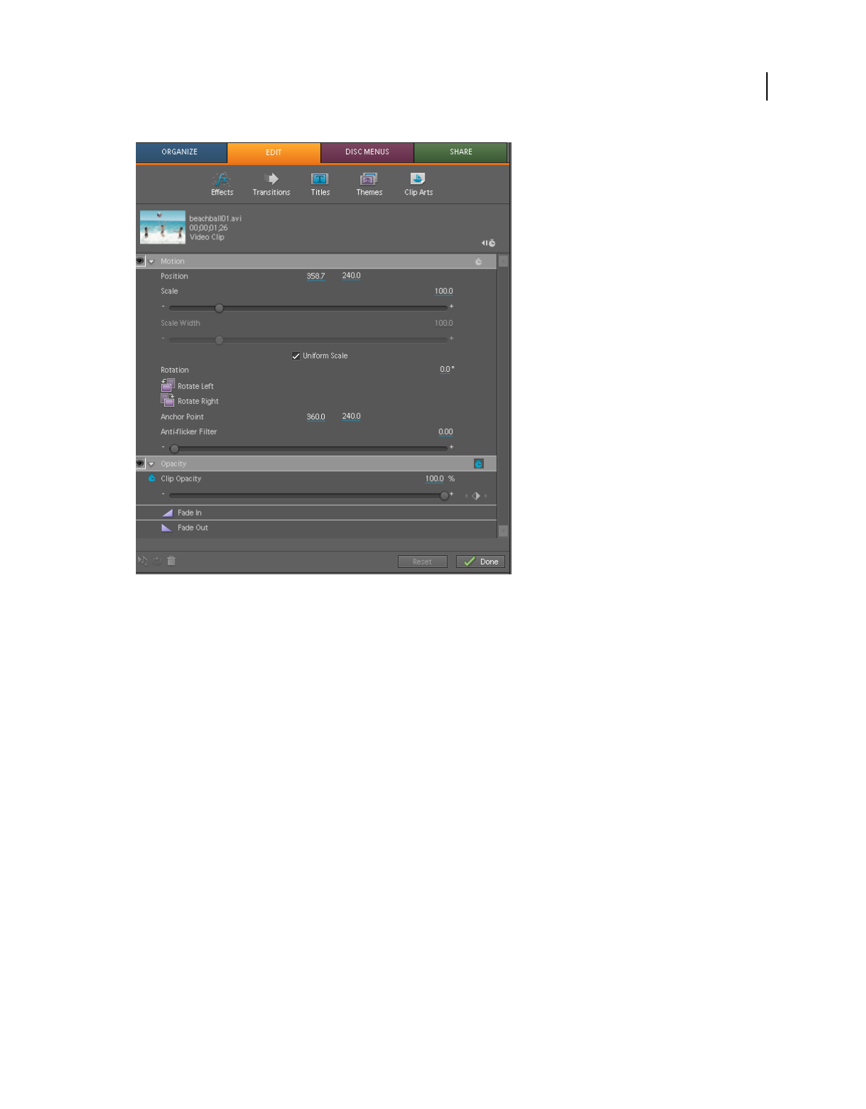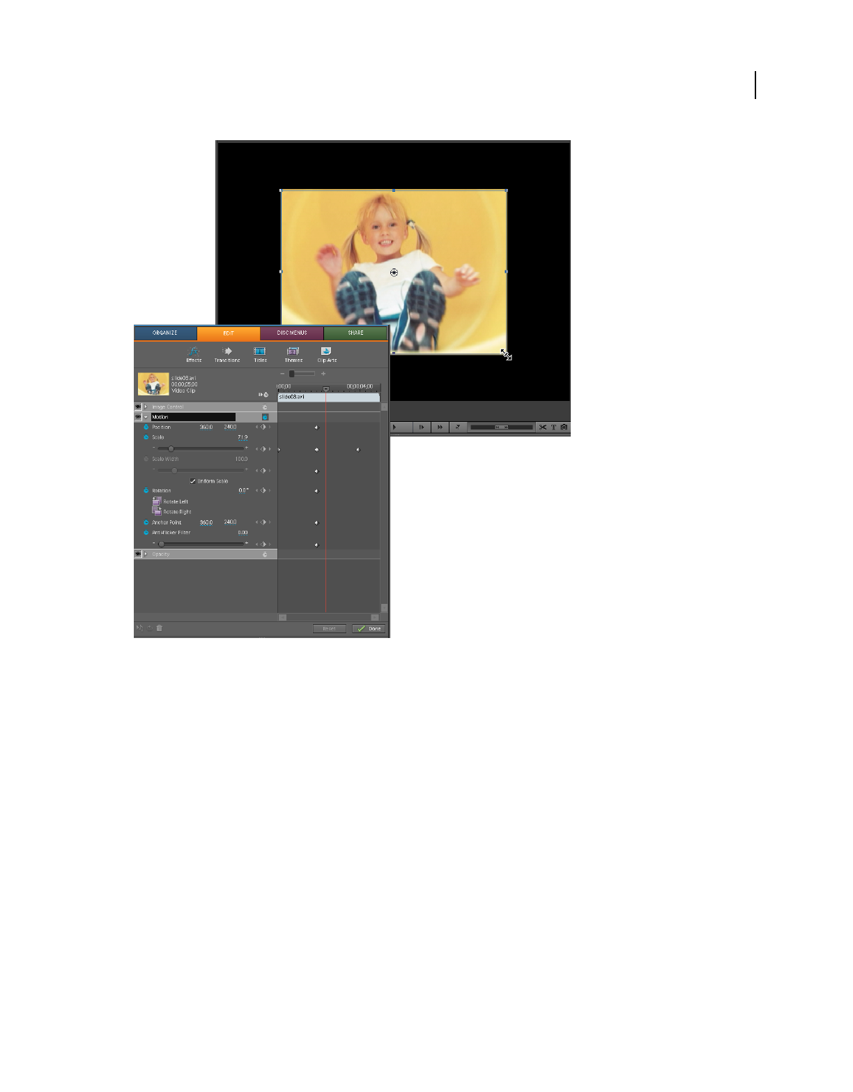 - Reposition, scale, or rotate clips with the Motion effect