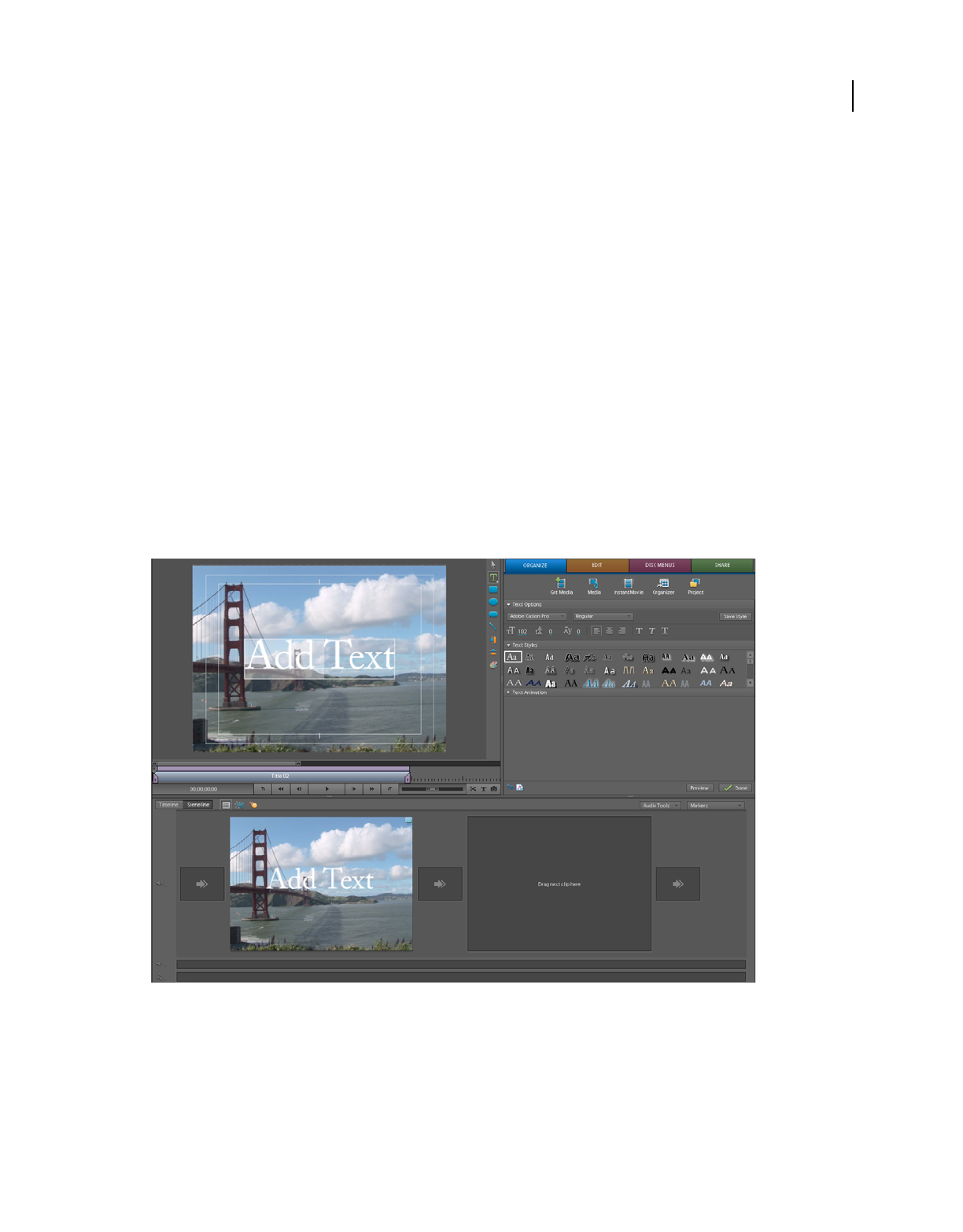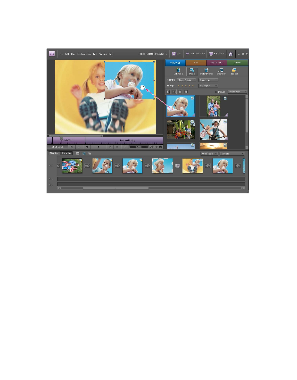 Sceneline Provides a visual layout of media clips so you can quickly arrange your clips, as well as add titles, transitions,