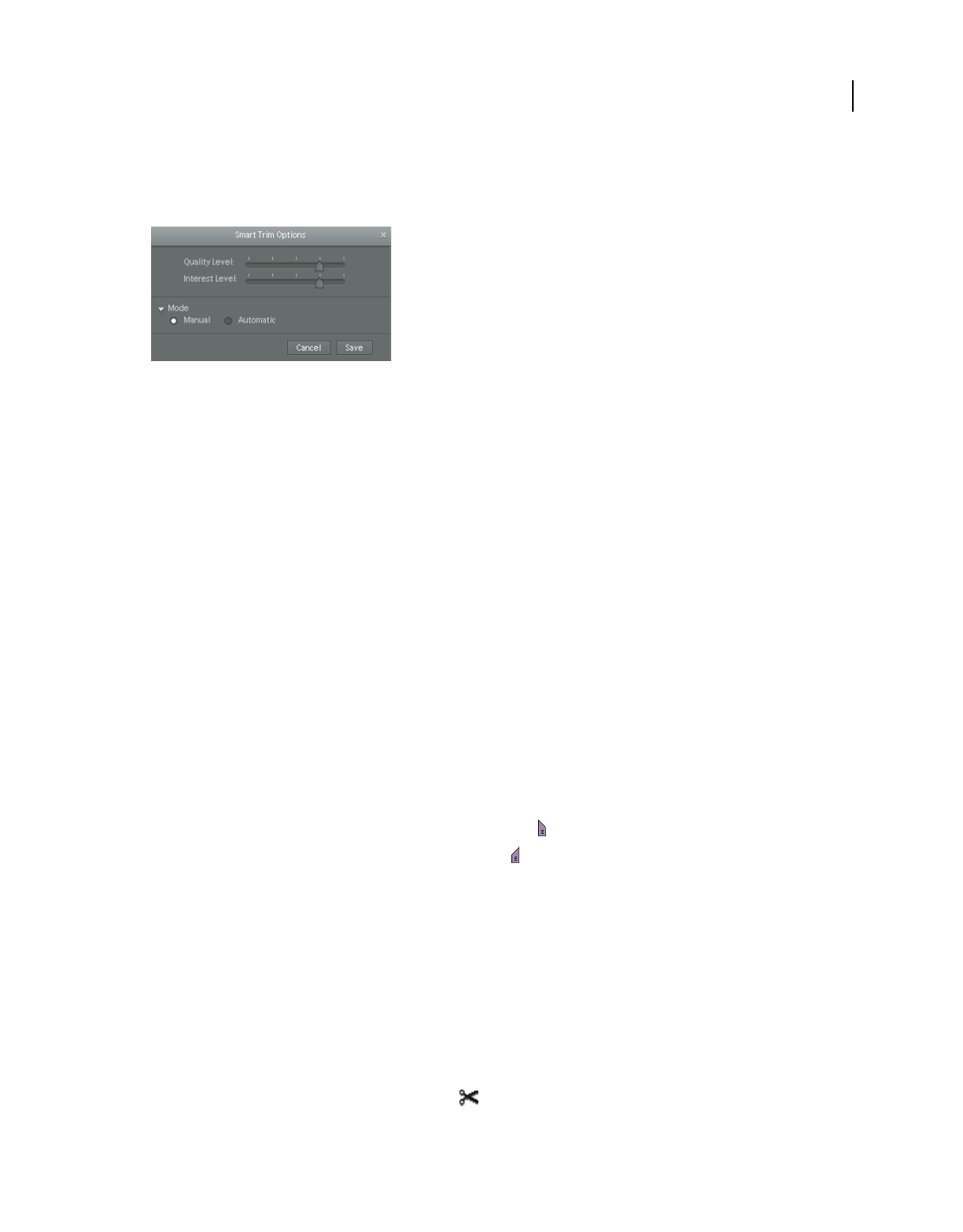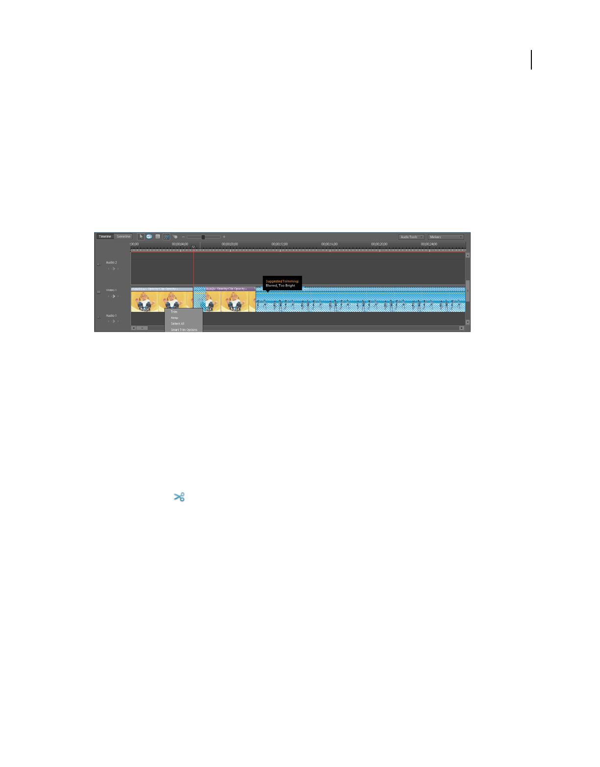 trimming Removing frames from the beginning, middle, or end of a clip.