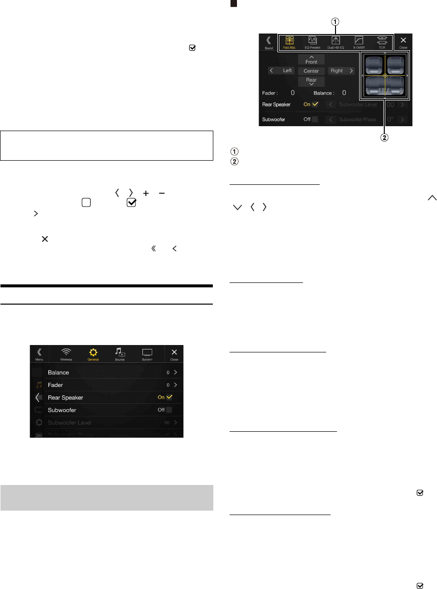 - General Setup- Sound Setup- Setting the Balance/Fader/Rear Speaker/Subwoofer