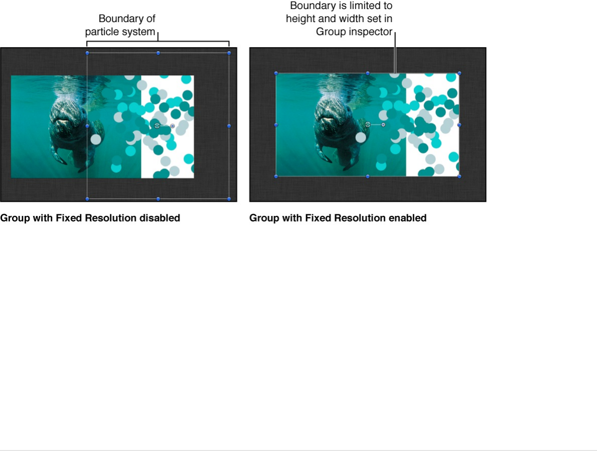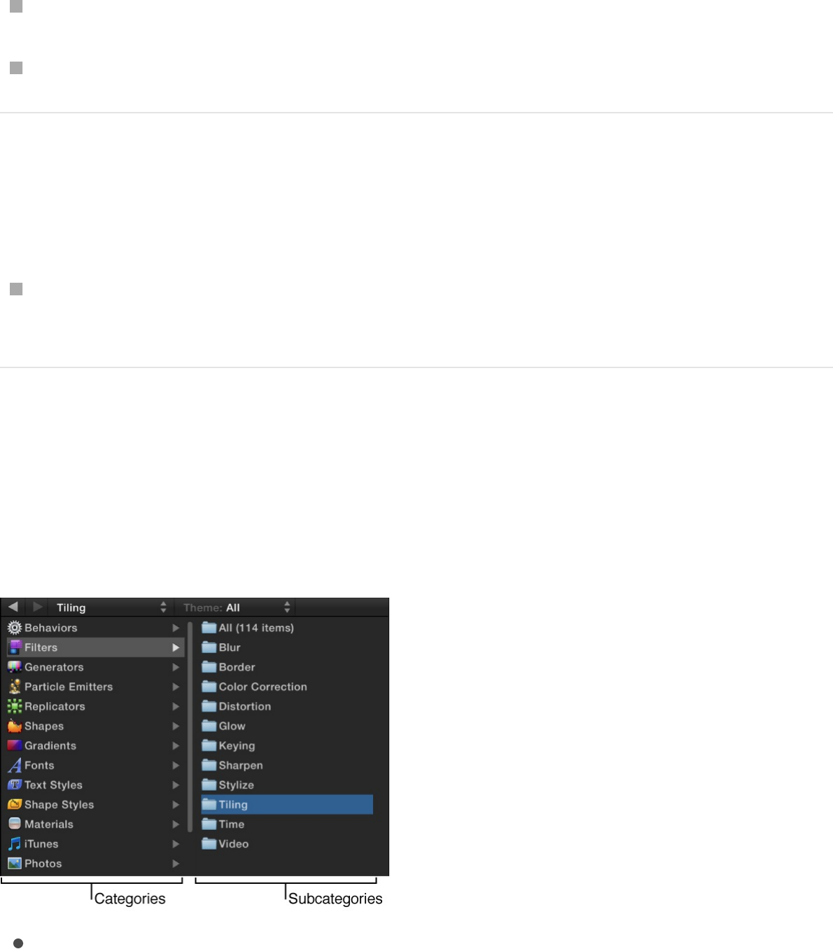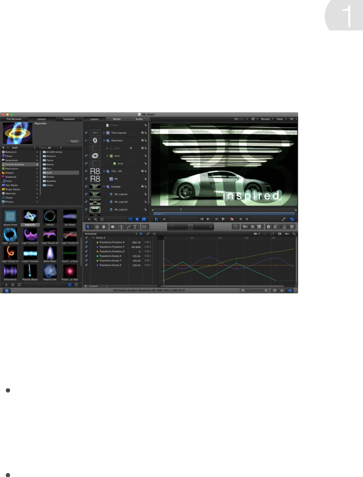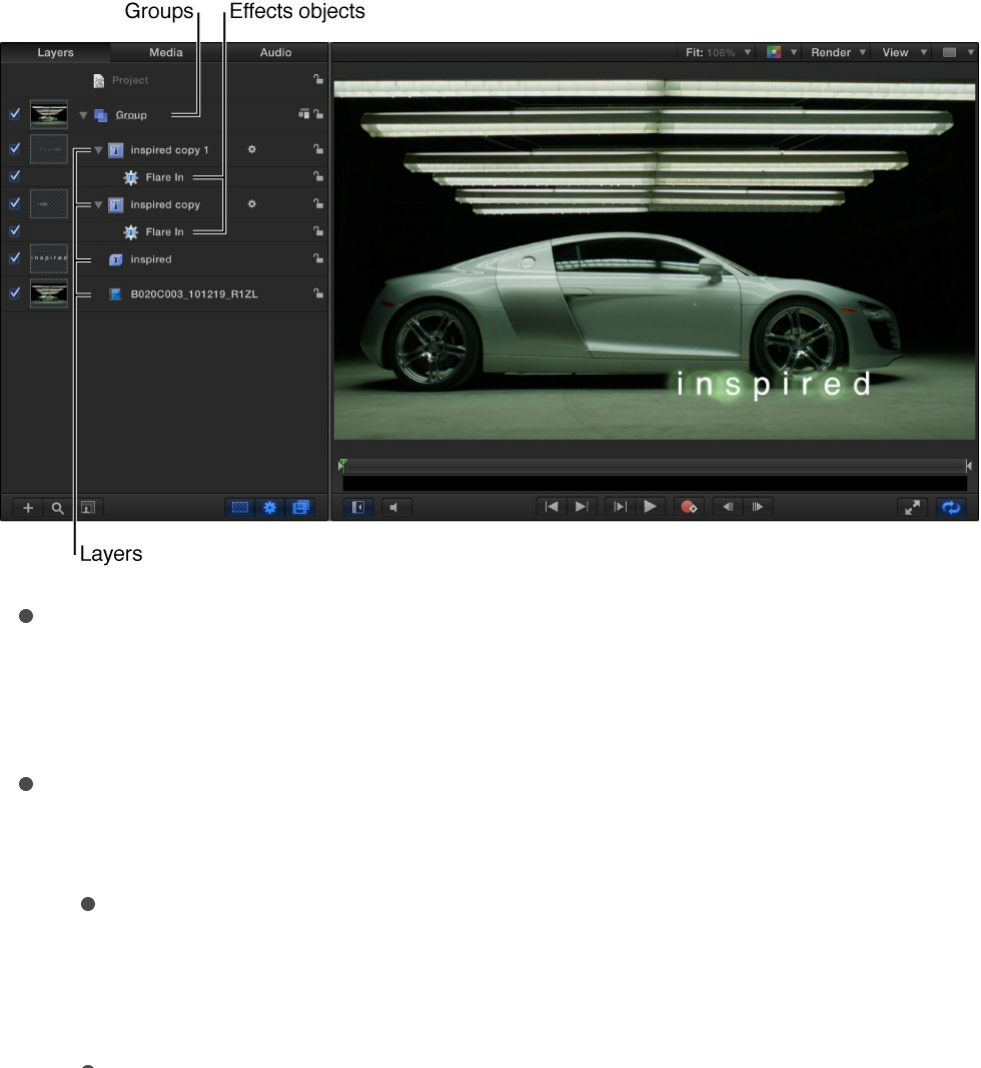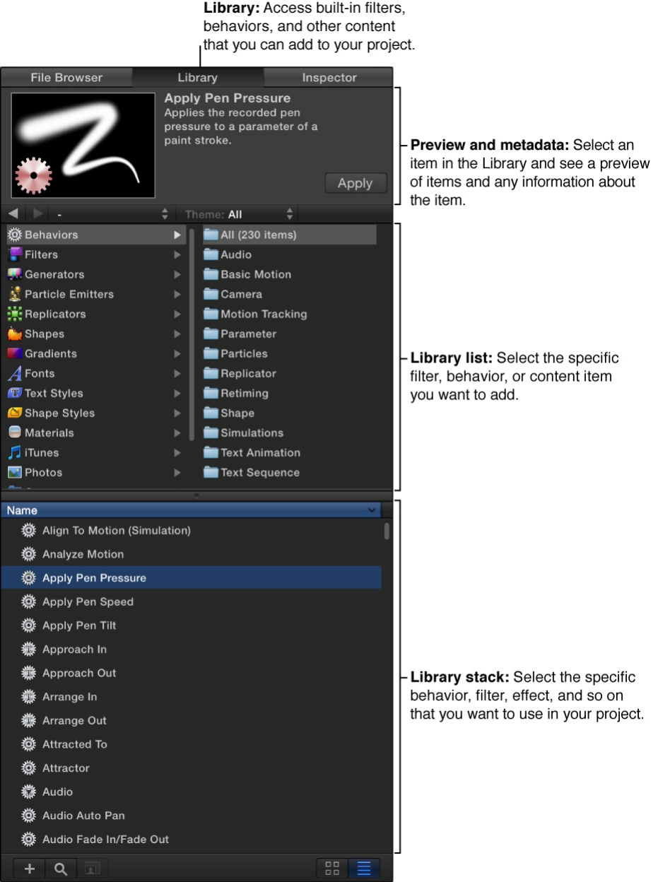 comes with Motion, such as preset particle emitters, text, or