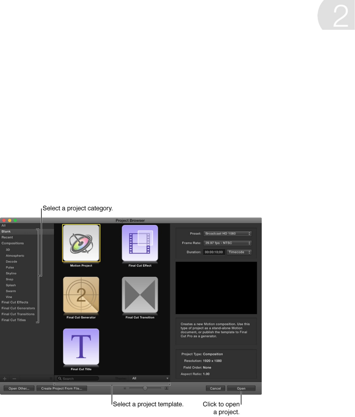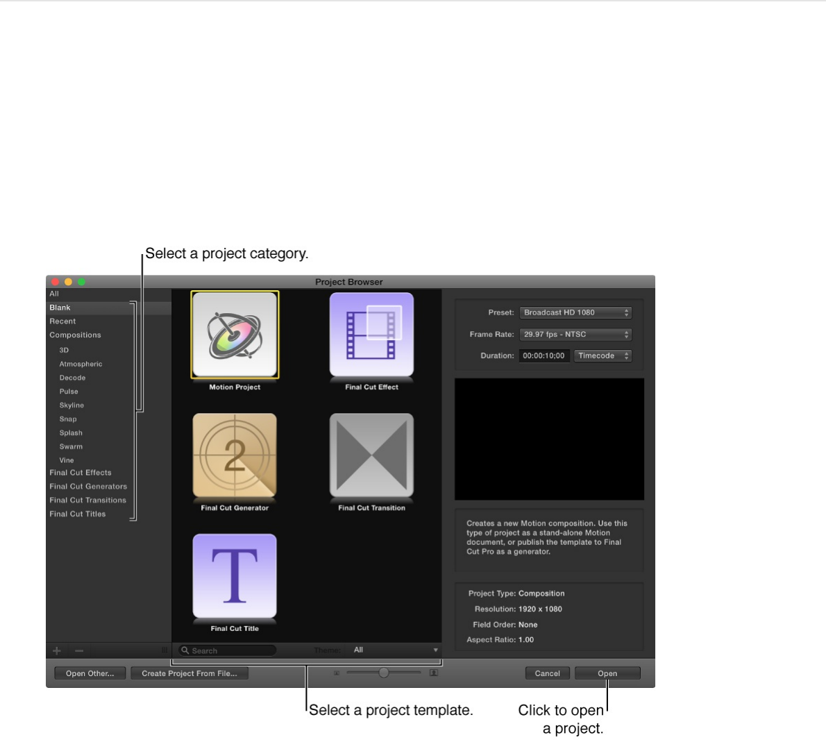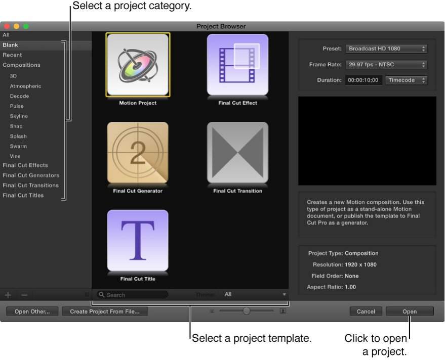 You can create a blank project, open a preset composition, or