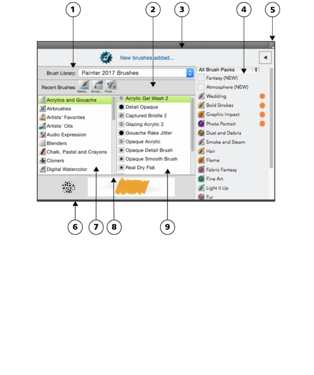 Individual brushes, known as brush variants, are stored in the Brush library panel in different brush categories. For more information, see
