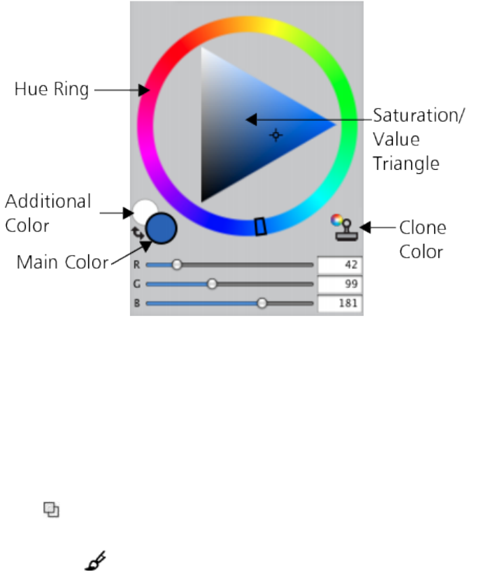 hue. Dragging to the left, or clicking on the left, reduces the color saturation and produces “muddier” or grayer colors.