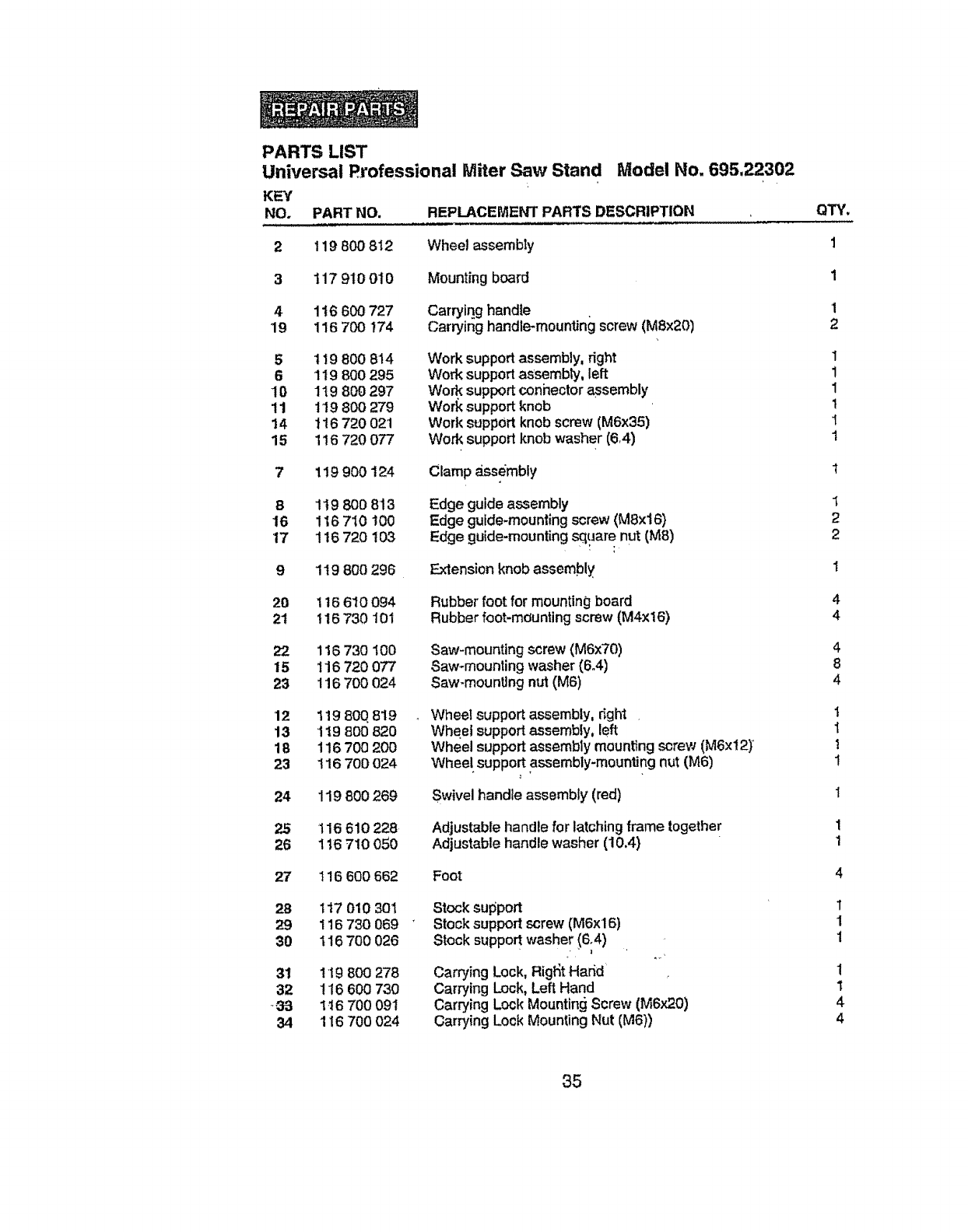 NO. PART NO. REPLACEMENT PARTS DESCRIPTION